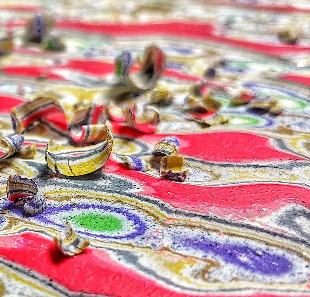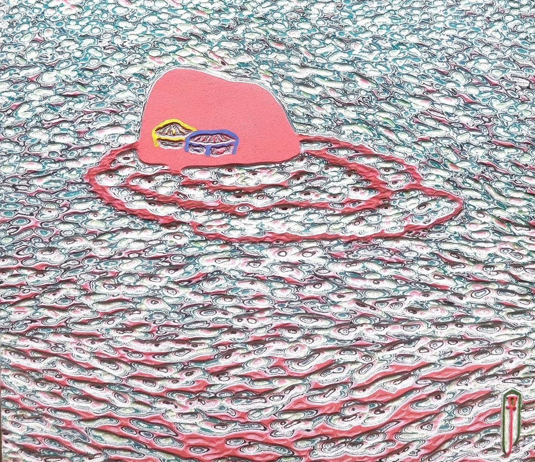 이런 방식으로 작업하게 된 계기는 약 십오 년 전으로 거슬러 올라간다. 첫 전시를 앞두고 원하는 그림이 나오지 않아 계속 덧칠만 하며 시간을 보내다가 우연히 옆에 있는 조각칼로 덧칠한 물감을 긁어냈는데 생각지 못한 빛깔들을 만나게 된 것이다. 그는 거기서 어렸을 때 아버지의 공방에서 가지고 놀았던 자개의 무늬를 보았다고 했다. 이를 계기로 그는 조탁 기법을 부단히 몸에 익히기 시작했고, 햇살이 부서지는 통영 바다의 윤슬이 고스란히 화폭으로 옮겨졌다.