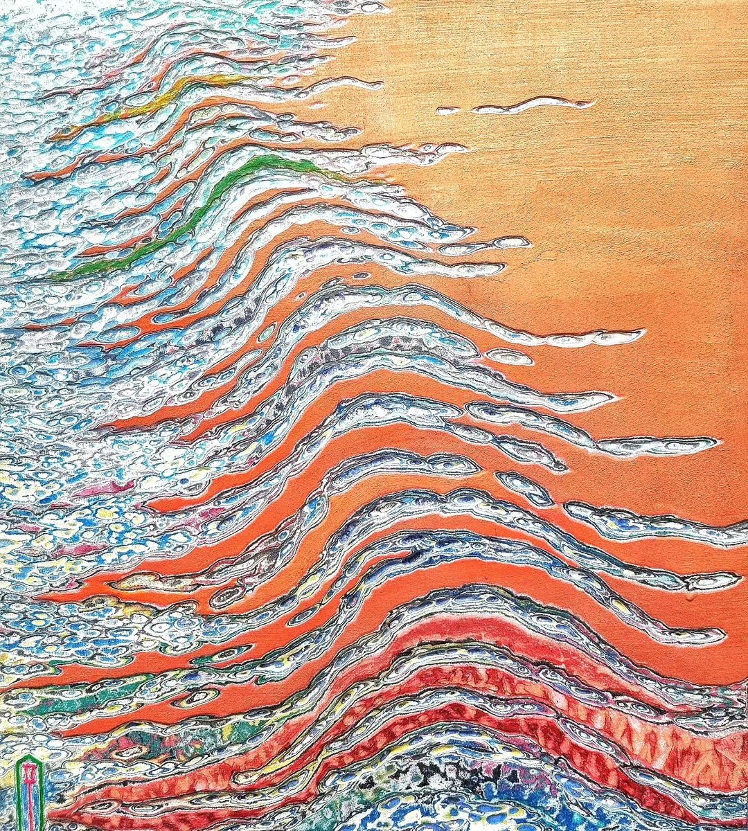 화가 김재신이 보여주는 통영의 바다와 산 그리고 땅은 붓이 아닌 칼끝에서 태어난다. 가까이 다가가 그의 그림을 보면 화폭 가득히 펼쳐지며 넘실대는 다채로운 색의 주름에 절로 탄성이 나온다.