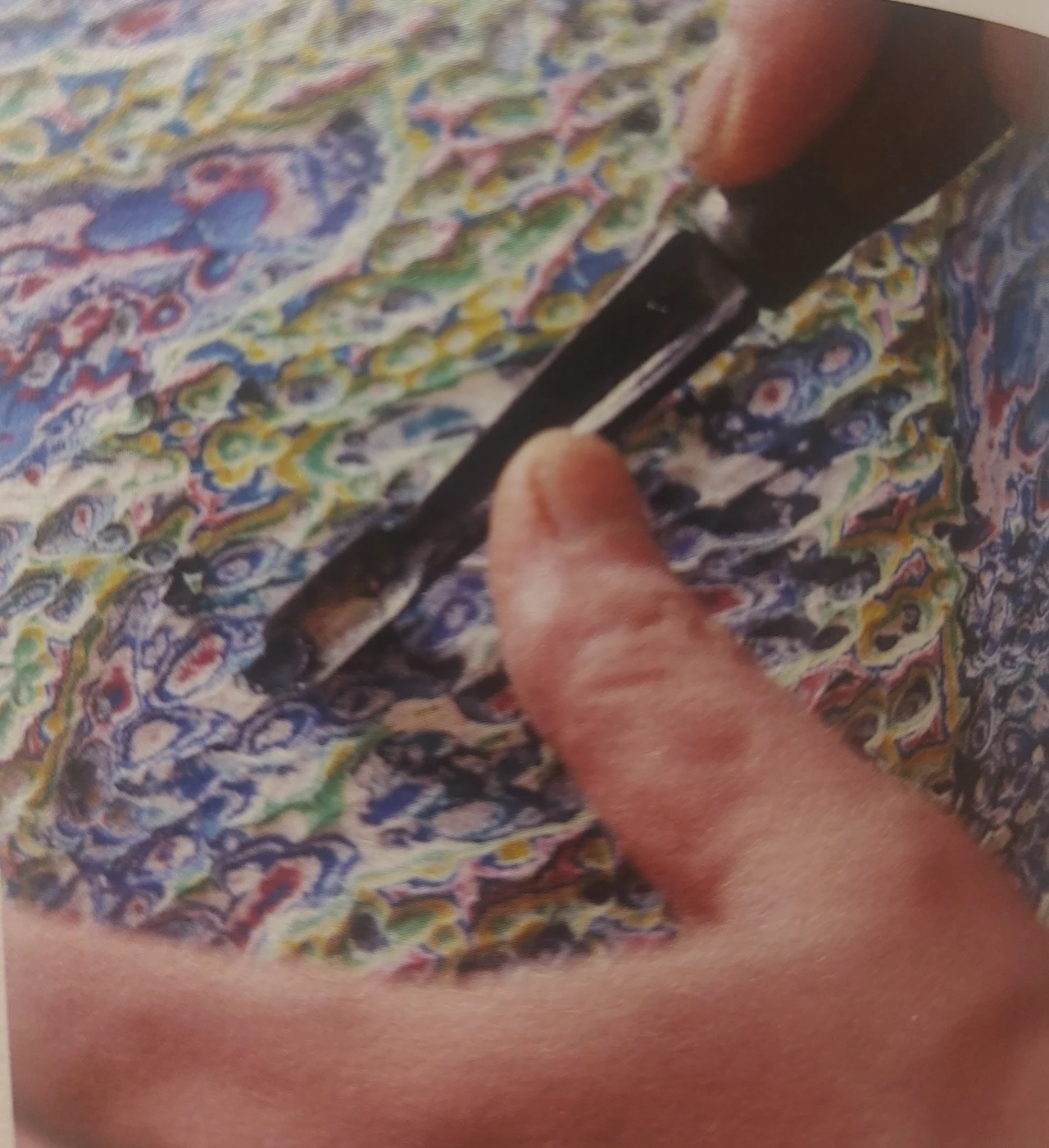 30~40층의 물감 층을 쌓아 만든 후 조각칼로 색을 덜어내는 조탁 직업 과정