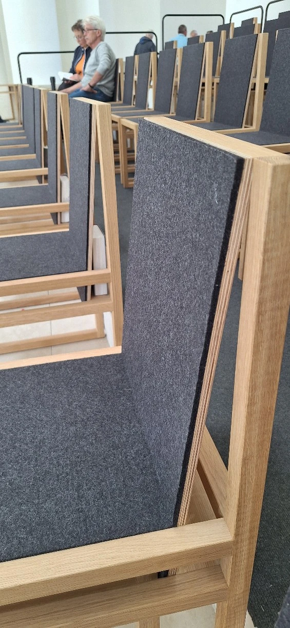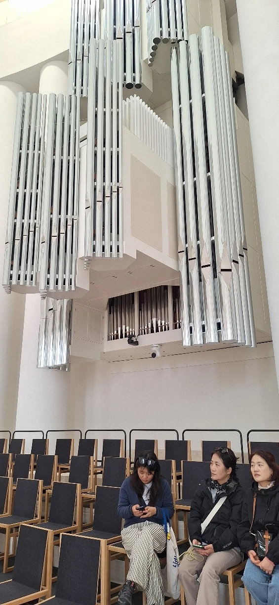 제단을 마주 보고 있는 벽엔 은빛 파이프 오르간이 설치되어 있고 그 아래엔 진회색 양모 펠트가 깔린 나무의자들이 설교대를 향해 놓여있었다. 대부분의 교회나 성당 신도석은 나무 벤치 형태인데 반해 헤트비히 성당은 원형 극장의 객석처럼 일인용 의자가 제대를 빙 둘러싸고 배치되어 있었다.