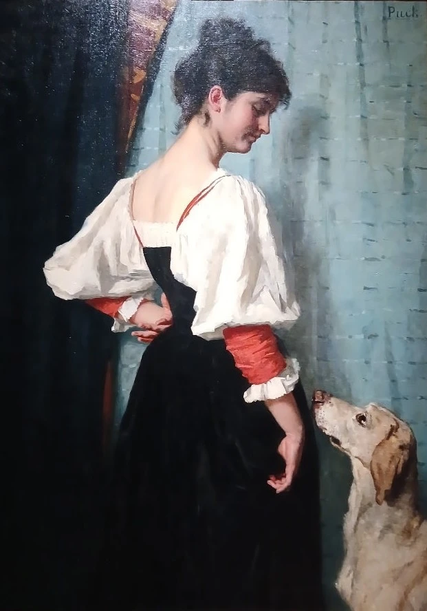 이 작품은 네덜란드의 여성화가 테레사 슈바르체 (Theresa Schwartze, 1851~1918)가 그린 <Young Italian Woman, with 'Puck' the Dog>이다.