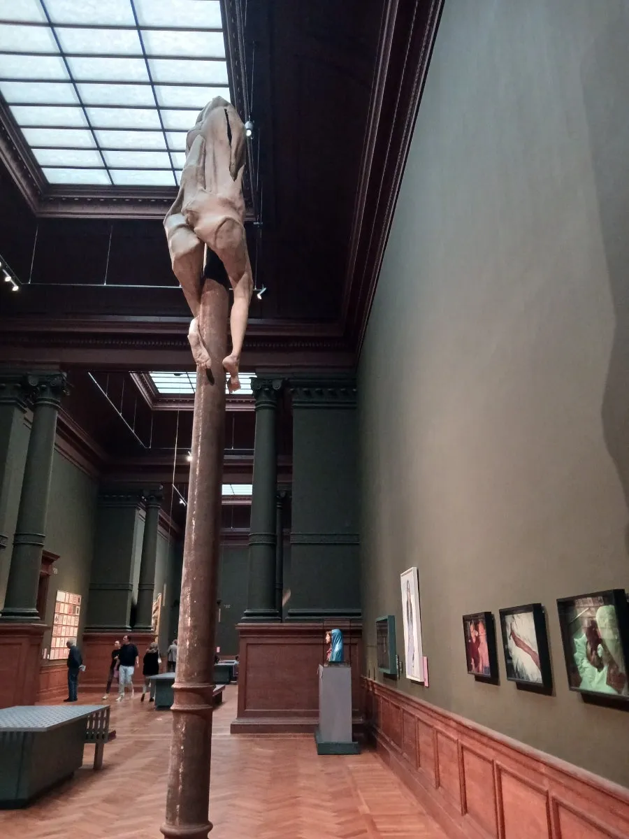 작품들을 따라가다 보니, 미술관 천장에 닿을 듯한 높이의 기둥이 우뚝 서있었다. 자세히 보니 꼭대기에는 벌거벗은 채 매달린 몸이 아래를 내려다보고 있었는데, 마치 제단화 속 십자가가 그림 밖으로 나온 듯한 느낌이었다.