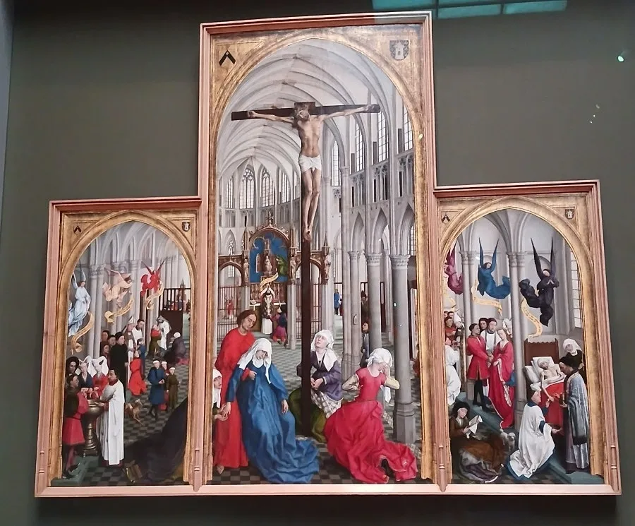 이 삼단 제단화 중앙에는, 십자가에 높이 매달린 예수와 그 아래에서 실신한 마리아가 있다. 그녀를 부축하고 제자 요한과 마리아 막달레나의 모습도 보인다.