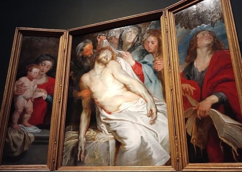 십자가에 매달려 죽어간 예수를 땅으로 내려 애도하는 장면은 중세시대 이전부터 그림과 조각으로 만들어져 온 도상이다. 첫 번째 작품은 루벤스의 작업실에서 주문제작된 3단 제단화인데, 환하게 빛나는 예수의 몸과 마리아의 핏기 없는 표정이 슬픔을 극적으로 보여주고, 앤소니 반 다이크의 <죽은 예수를 위한 애도>는 예수의 수척한 몸을 통해 그가 견뎌낸 고통과 희생을 전달한다.