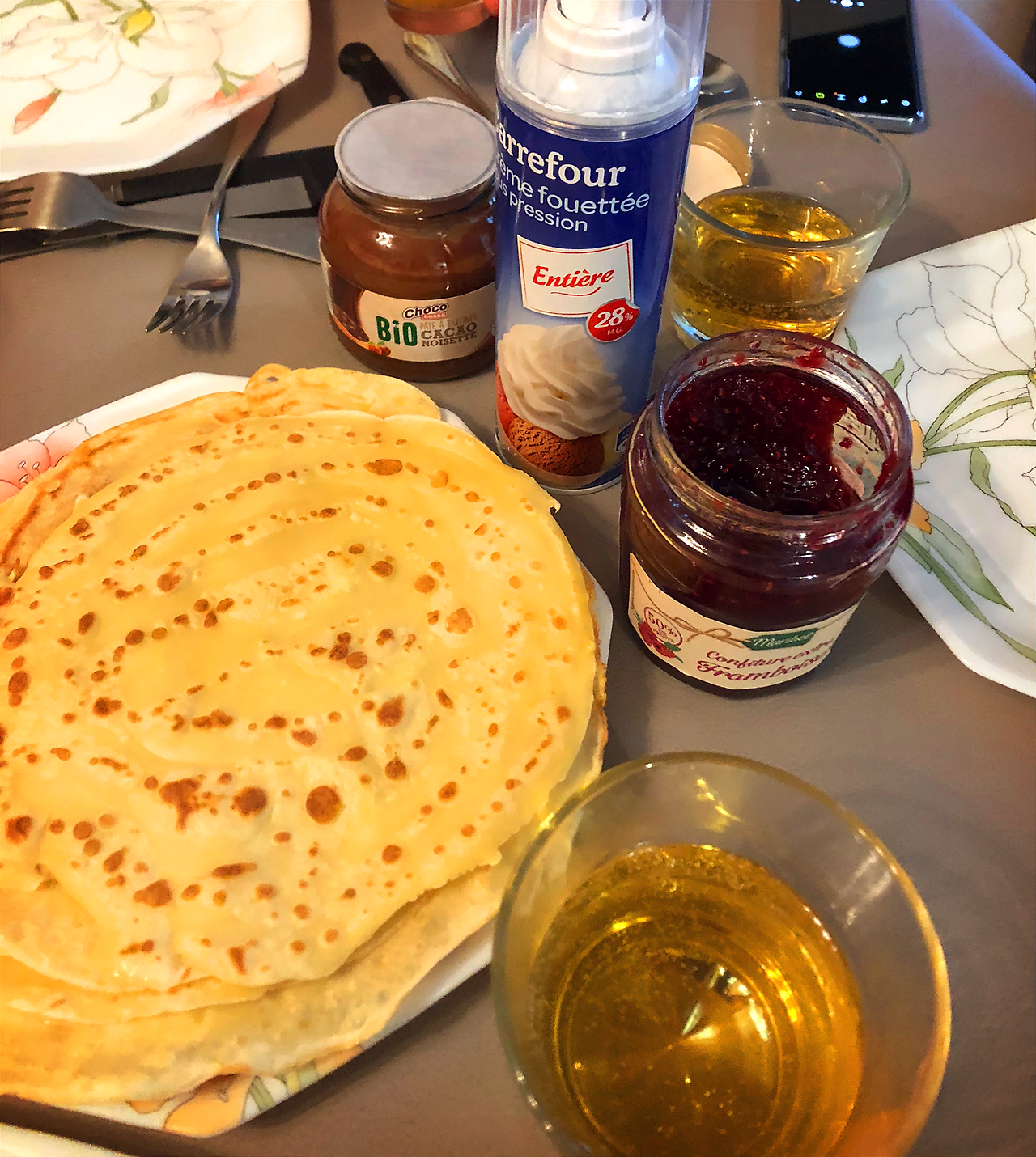 우유와 달걀, 밀가루 세 가지로만 만드는 단순한 크레이프지만 먹는 방법은 이렇듯 사람마다 다르다. 우리가 고기 쌈을 싸먹을 때와 비교하면 좋은 예시가 되겠다. 나는 상추에 깻잎, 생마늘에 쌈장 구운 고기를 참기름과 소금장에 찍고 파채를 그득 올린 쌈이 제일 좋다. 쌈을 싸는 당신만의 선호가 있으리라. 보통은 자라면서 집에서 먹어온 방법이 개인에게 스며드는 법, 프랑스인들도 어릴 때 먹던 크레이프의 흔적이 오래 간다. 2월 2일은 '크레이프 날Virgin Mary’s Blessing Day '이라고 하여 가족이 둘러 앉아 크레이프 식사를 하는 전통도 있는 나라다.