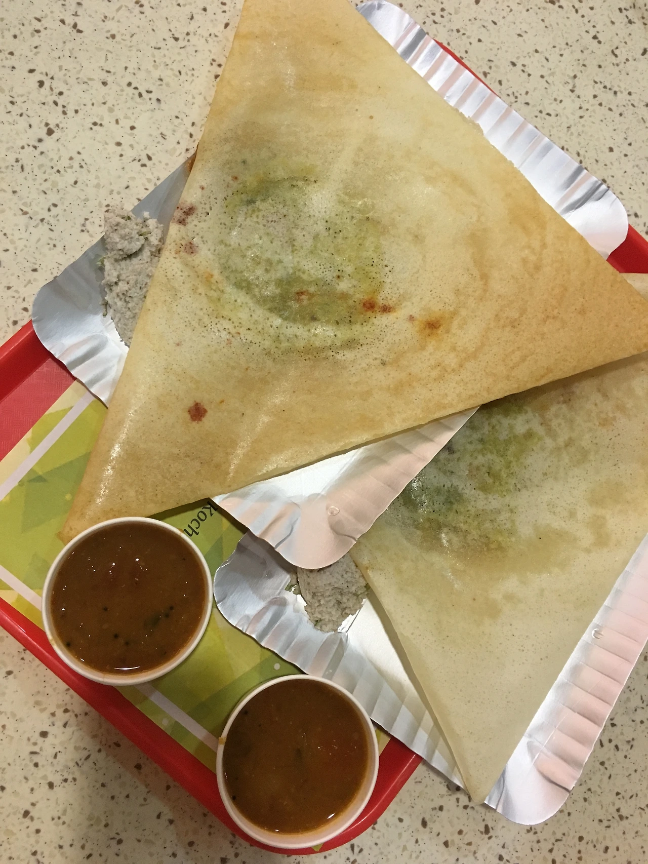 현지인과 가는 마트 구경은 언제나 좋으니까, 피곤해도 무조건 함께 가는 편이었다. 특히 혼자 다니기 쉽지 않은 인도에서의 기회는 놓칠 수 없다. 피곤했으면서도, 채식으로 된통 힘 뺐으면서도 나는 식사로 인도 남부의 대표적인 채식 음식을 먹었다. 바로 내가 제일 좋아하는 ‘도사 dosa’. 보통 아침식사로 많이 먹는 얇고 바삭한 크레페와 흡사한 음식으로, 쌀과 렌틸콩으로 만든 반죽을 커다랗게 부쳐 안에 내용물을 넣고 세모로 접어준다. 코코넛 처트니, 감자, 야채 소스 같은 스튜를 곁들인다. 코코넛 쳐트니를 가장 좋아하는 나, 다섯 배는 비싼 호텔 룸서비스보다 야무지게 맛있게 해치웠다. 나를 데려간 인도인 크루가 이런 나를 보고 흡족하게 웃는다.