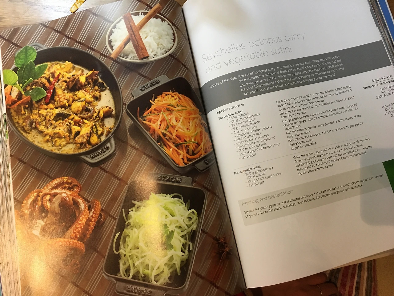 세상 모든 커리를 좋아하는 내가-커리를 만든 이에게 축복을-꽂힌 페이지는 낙지 커리였다. 생선 살을 넣은 건 봤어도 낙지를 넣은 커리라. 사진을 보니 국물이 좀 있는 쭈꾸미 삼겹살 ‘쭈삼‘ 느낌이 나는데 재료를 보면 강황(튜머릭) 가루, 커리 가루, 생강, 코코넛 우유 등 동남아시아 커리 같군. 세이셸 섬에 아주 흔한 재료가 바로 낙지와 코코넛이라고 적혀있다.