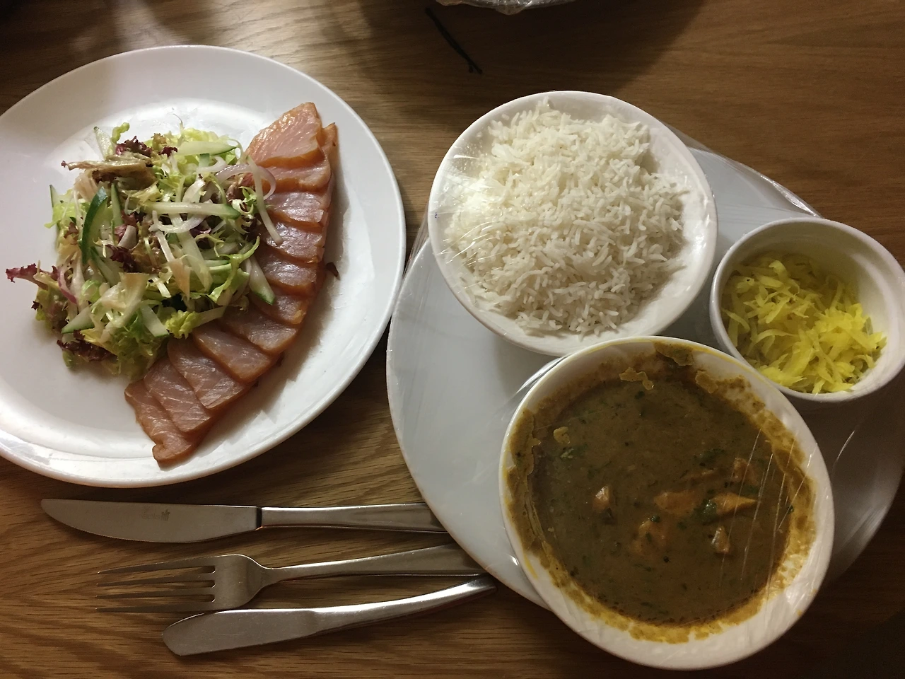 멋지게 스타일링한 요리책 사진과 달리 랩에 덮여서, 방으로 오는 도중 서버의 발걸음에 맞춰 흔들렸을 커리 국물 자국이 남은 국그릇은 모양새가 조금 다르다. 그래도 약소한 팁을 건네준 다음 책을 다 덮어놓고 저녁상을 준비한다. 랩을 벗기니 커리 냄새가 확 풍겨온다.