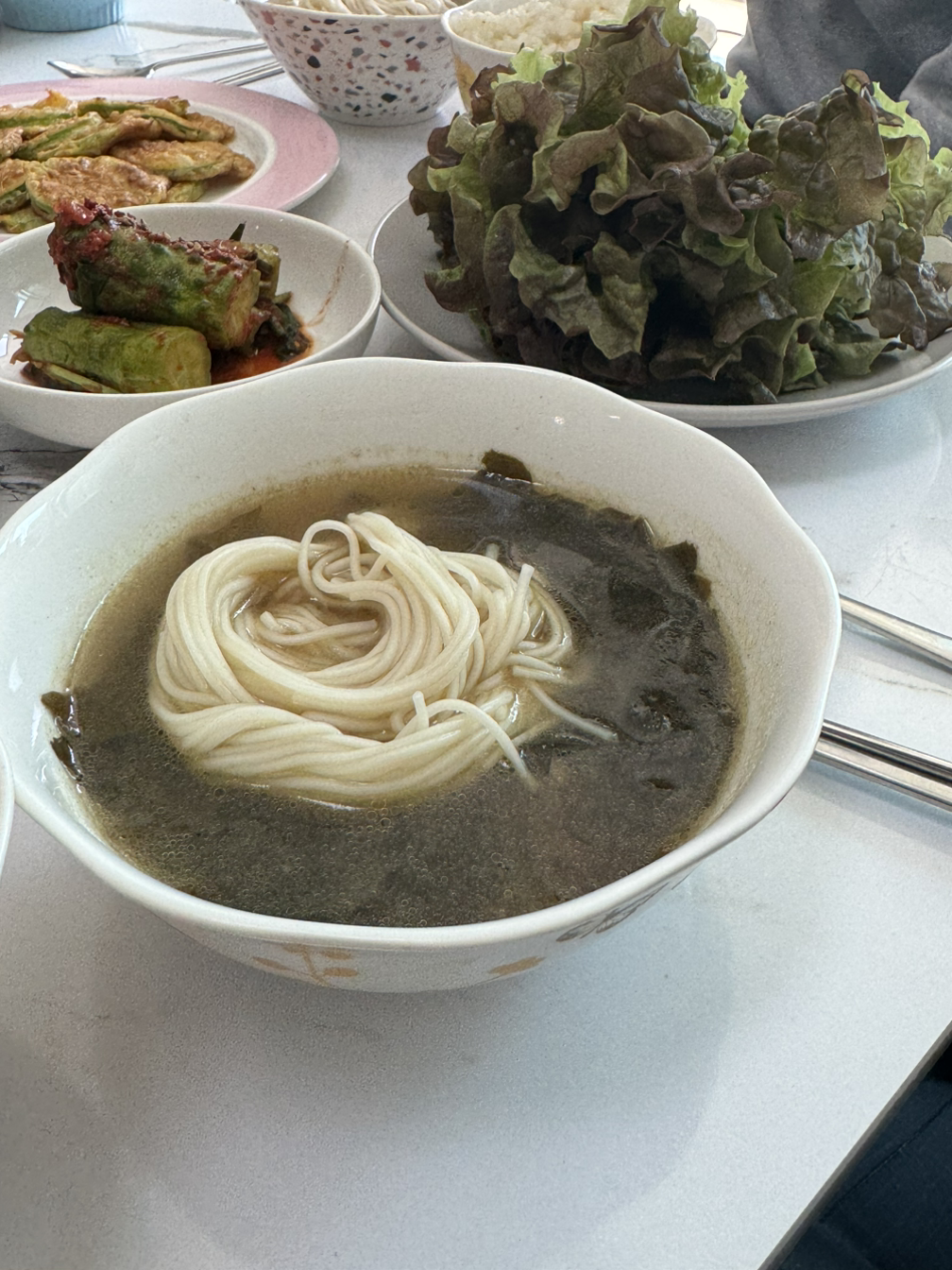 이사를 막 끝낸 터라 나름대로 집들이 겸 친정 떠나기 전 언니 집에서 밥을 먹자 했는데, 언니는 정리하다 보니 자정이 넘어 새벽 두 시까지 식구 열 명의 미역국을 끓였단다. 좋은 한우 국거리를 잔뜩 넣어 미역보다 고기가 더 많을 것 같다. 언니는 하면 못하는 건 아닌데 요리에 취미가 전혀 없어서 평소에도 엄마가 반찬을 해주시고 밀키트 등을 애용한다. 그럼에도 대용량 미역국에 국수도 삶고(우리 집은 경상도 외할아버지의 영향 아래 생일 미역국엔 항상 소면을 말아먹는다), 애호박 전까지 부친 한 상을 보니 얼마나 정신없었을까 싶다. 기억도 안 날 만큼 언니가 앞치마를 두른 모습도 오랜만이다.