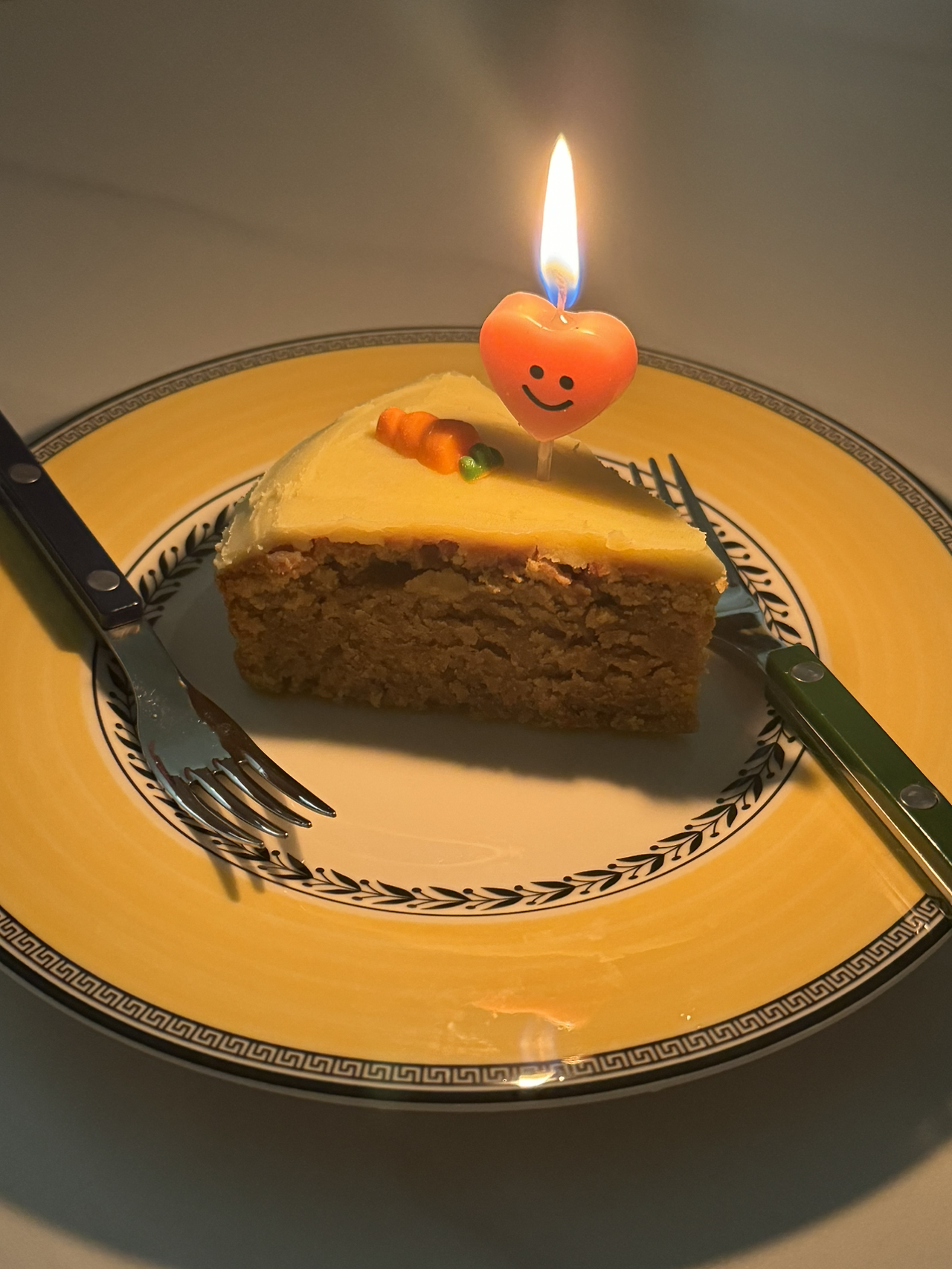우리 두 사람의 케이크 취향은 당근 케이크, 서로의 생일엔 당근 케이크를 먹기로 했다.
