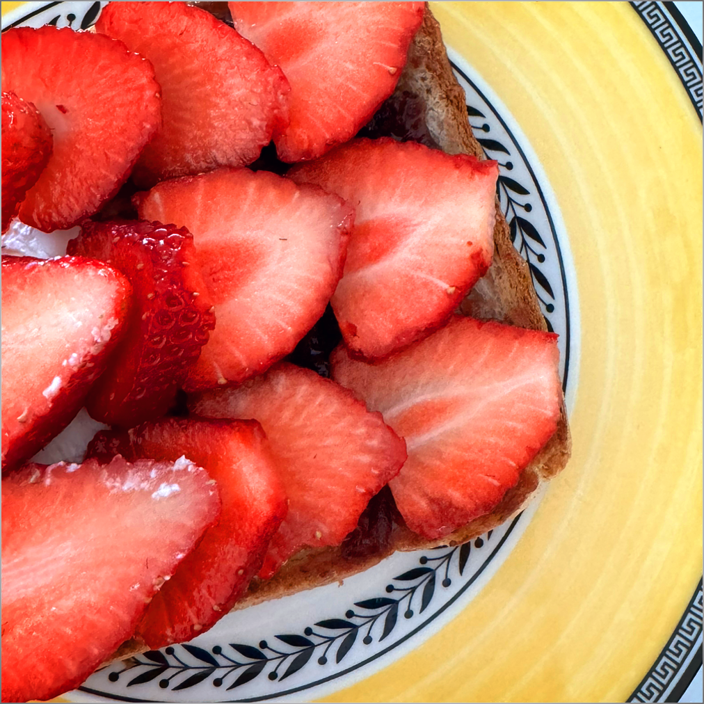 통밀 식빵을 버터 발라 구워 팥소와 크림치즈를 반반, 그 위에 딸기를 살포시 올려 간단하고 달콤하게