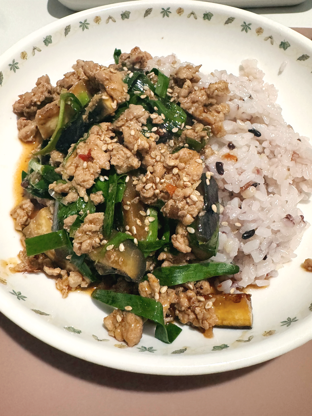남은 걸로 돼지고기 가지볶음 마무리에 숨만 죽여 넣어 덮밥으로 저녁을 지었다.