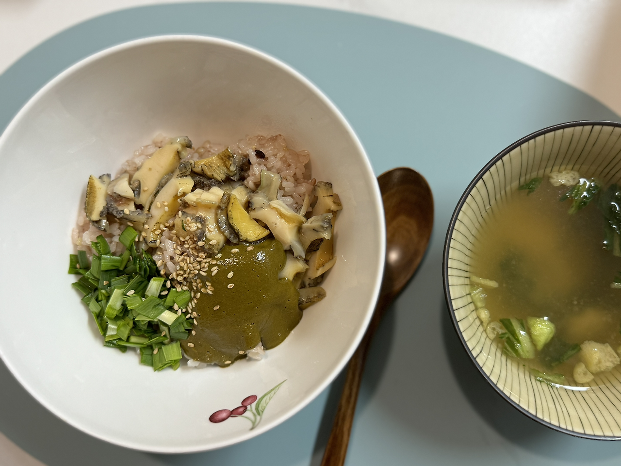 오늘은 전복죽 말고 전복 내장에 버터와 간장을 넣고 믹서에 간 소스로 내장밥을 만들었다.
