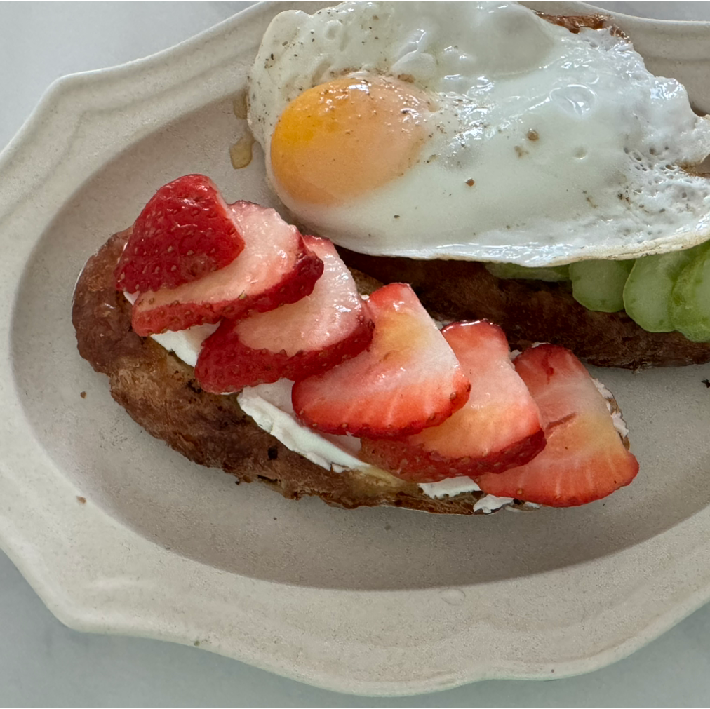 끼니 같으면서 간식보다는 열량이 좀 있게 바게트 빵 하나에는 머스터드 소스와 오이, 달걀 프라이를 올리고 다른 하나에는 마스카포네 치즈에 딸기, 꿀을 뿌려 두 가지 다른 오픈 토스트로 어중간한 오후 세시 반의 식사를 했다. 이렇게 먹으니 저녁 일곱 시쯤 남편과 하는 식사 때 또 잘 먹는다.