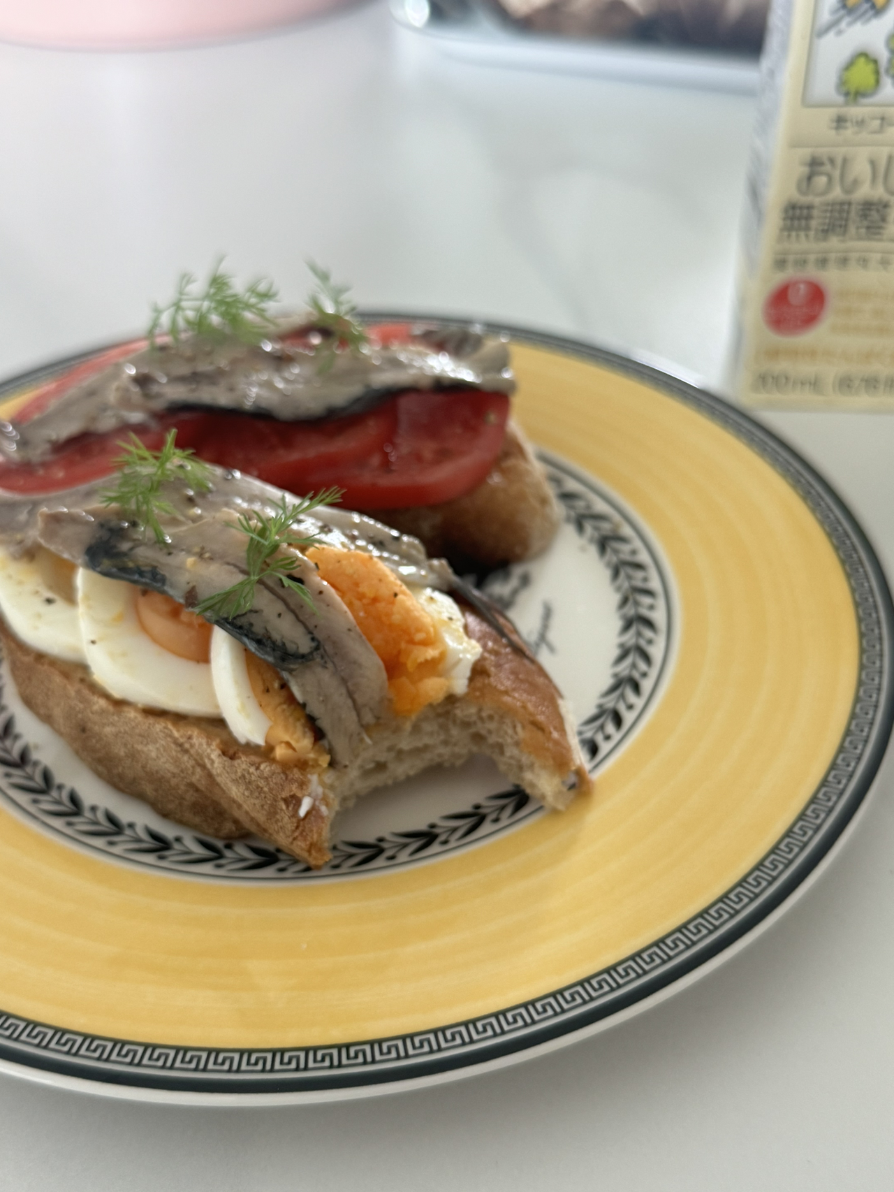 이틀 전 만든 생멸치 절임, 식초에 마리네이드 한 앤쵸비를 꺼냈다. 통조림이 아니다 보니 절였어도 오래 두고 먹을 수는 없어서 부지런히 꺼내 먹어야 한다. 두툼하게 썬 바게트를 살짝 구워 적당히 바삭하게 하고, 노른자가 완전히 익기 전 꺼낸 삶은 달걀과 잘 익은 토마토를 슬라이스 해서 준비. 빵 위에 각각을 올리고 멸치를 살포시 올린 다음, 작은 화분에서 기르고 있는 싱싱한 딜을 잘라 후추 약간과 마무리했다. 마요네즈를 빵 위에 조금 발라도 좋을 것 같은데 이미 완성해서 이대로 먹기로 한다. 산으로 절여진 멸치라서 산미가 있는 토마토보다는 달걀 쪽이 더 맛있다.