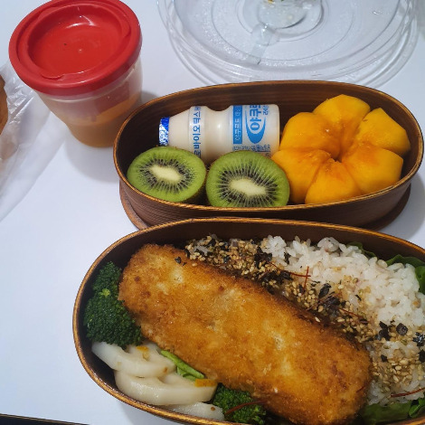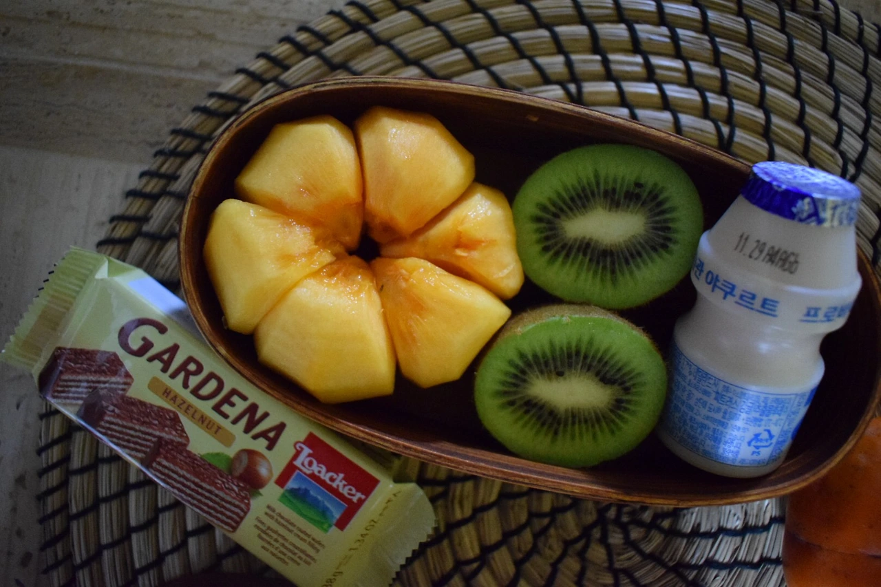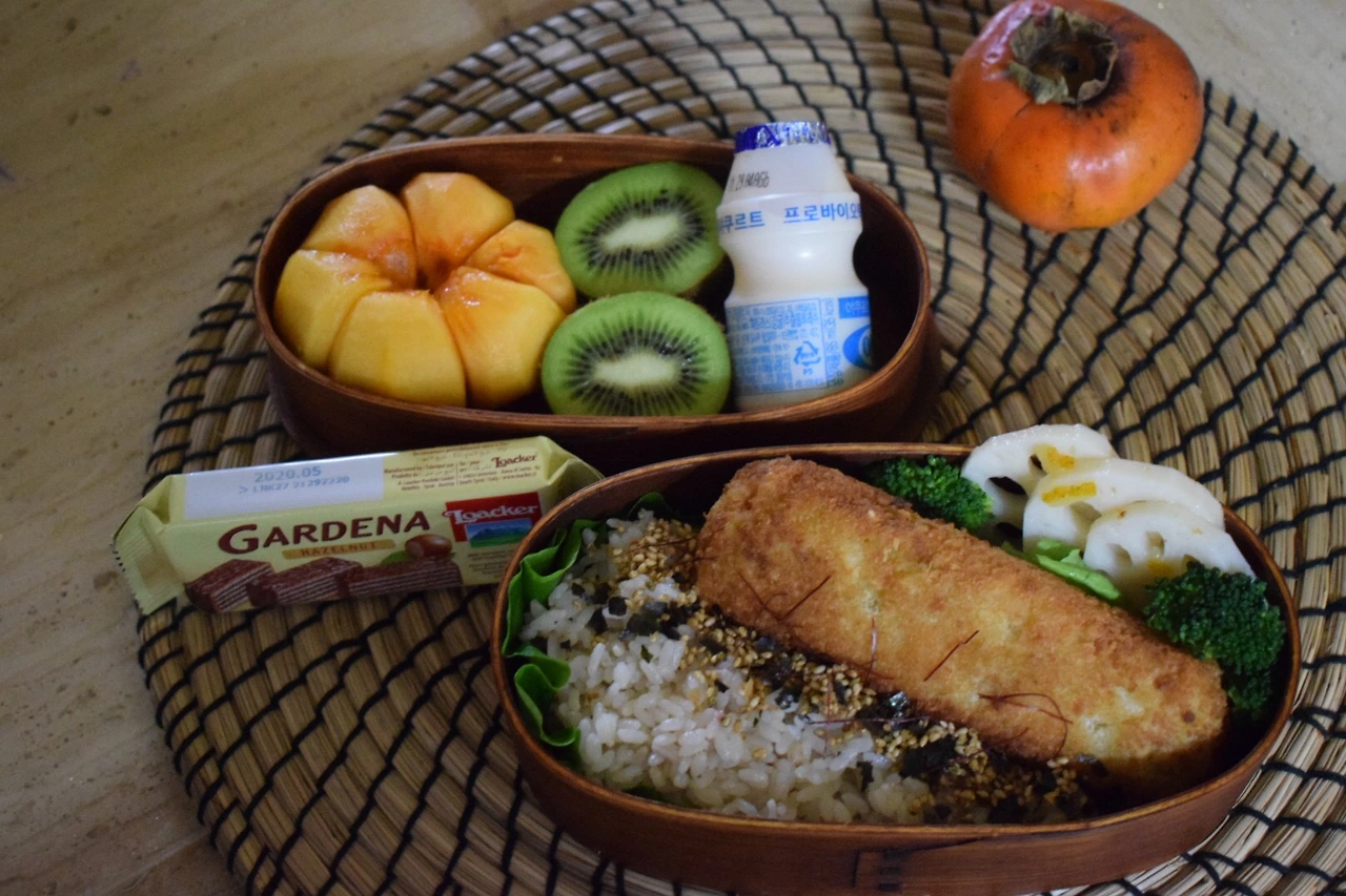 2단의 후식 칸엔 어김없이 단감이 들어갔고, 키위랑 요구르트, 로이커 와플 과자.
