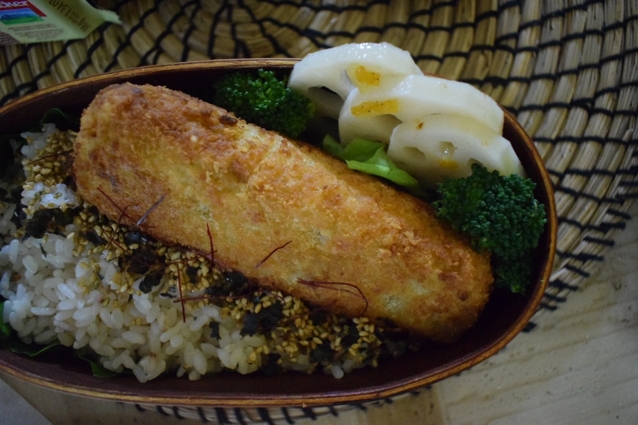 밥 위에 돈가스, 연근이랑 브로콜리로 빈틈 채우고 후리가케와 실고추 고명.