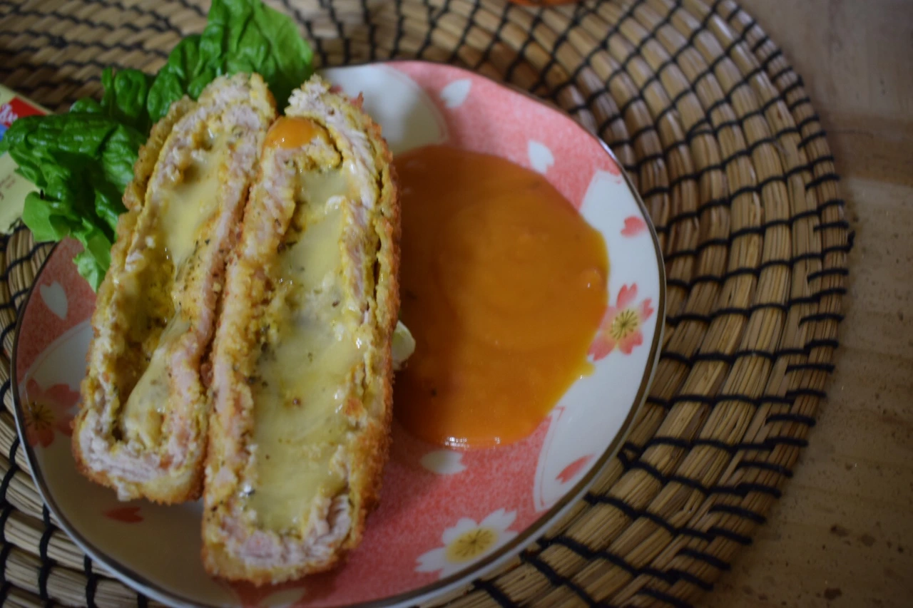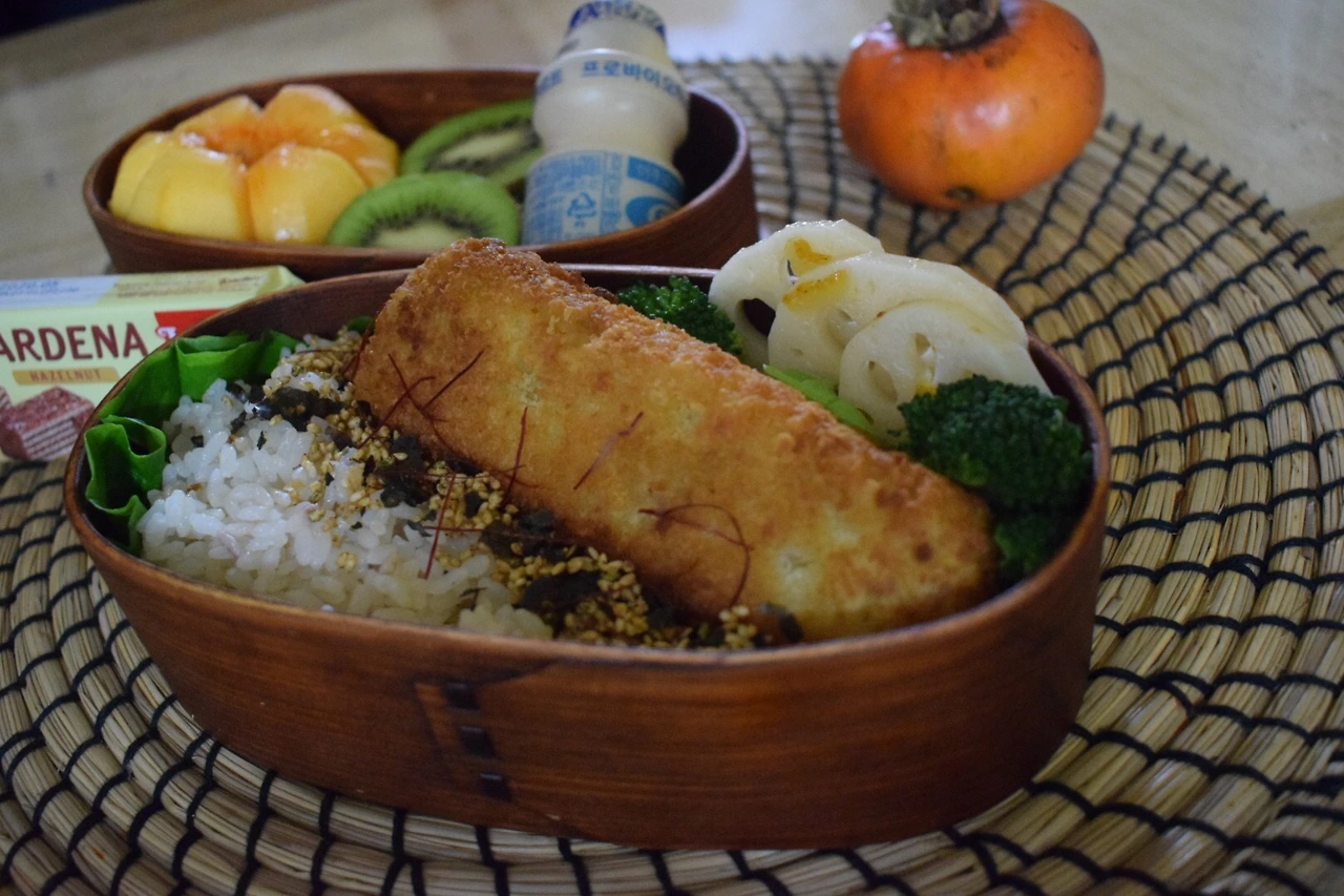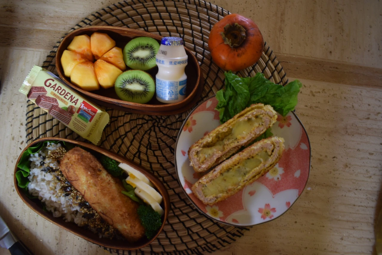 네 가지 치즈 돈가스랑 하나는 돌돌 말기에도 좀 작아서 그냥 넓적 돈가스.