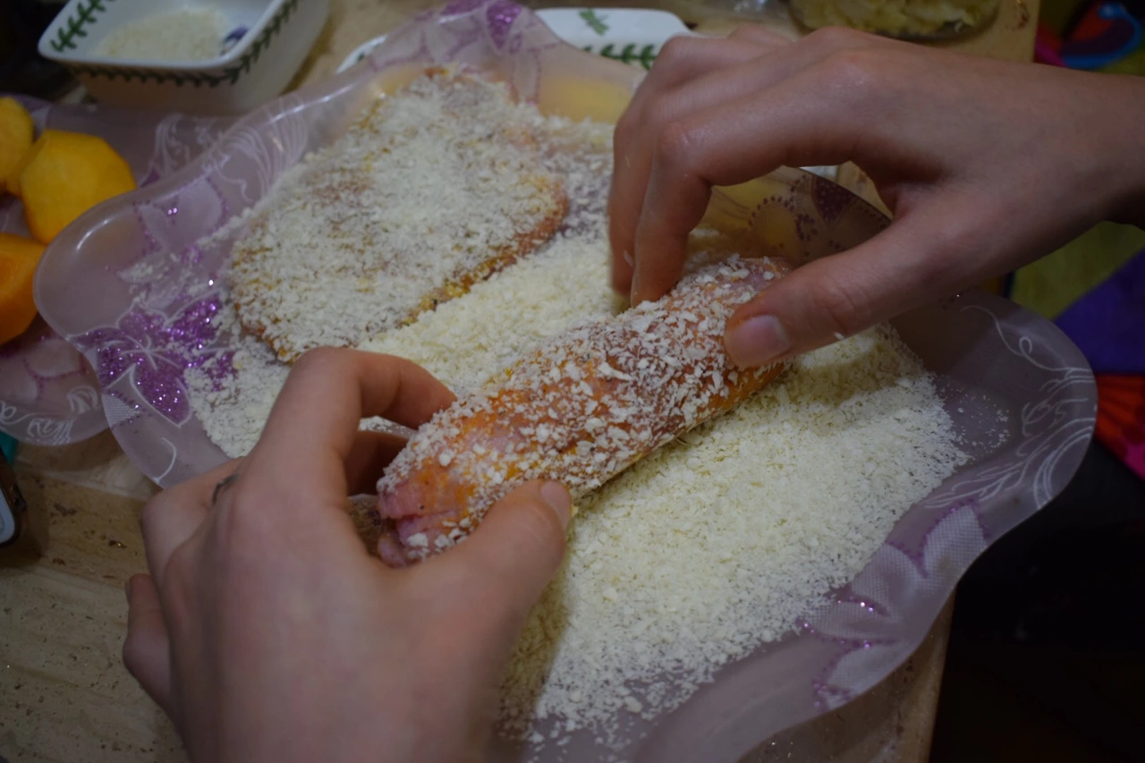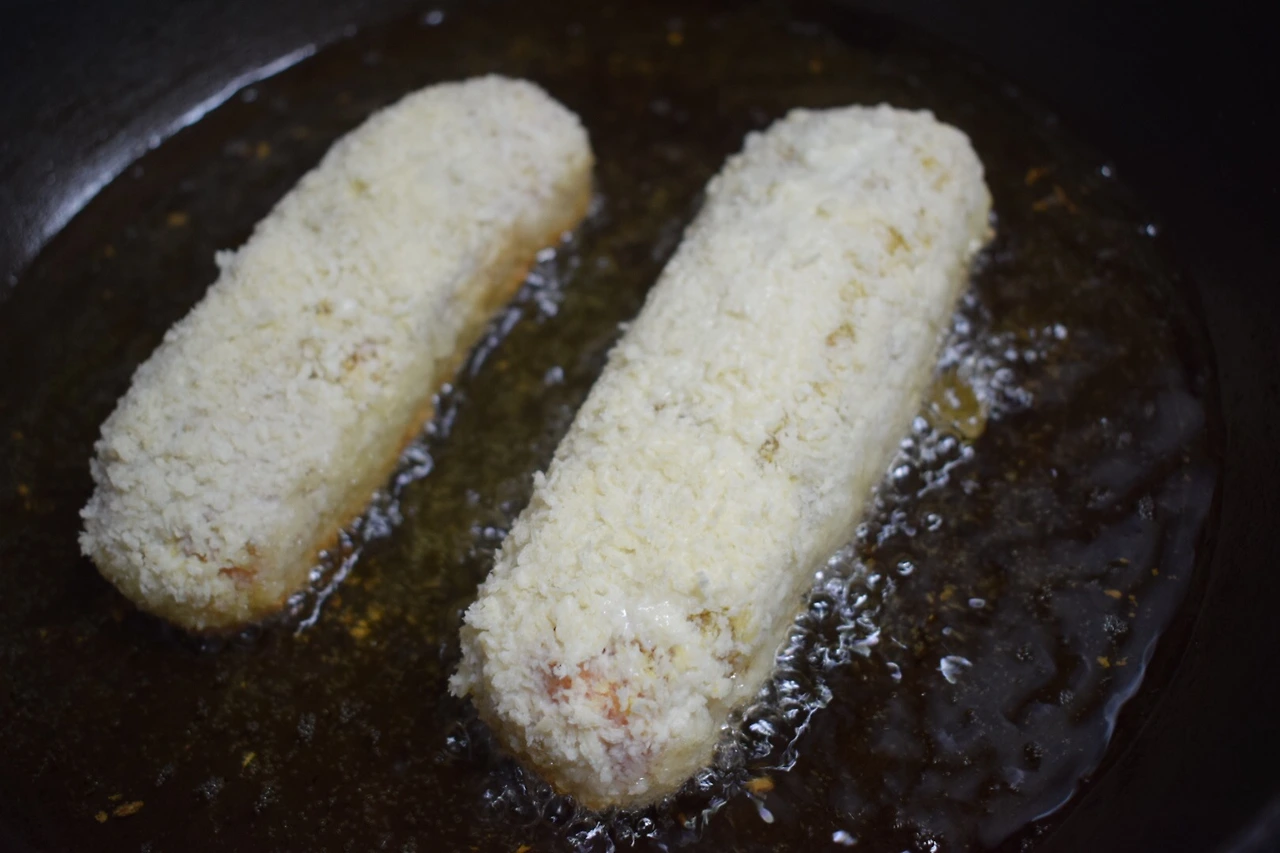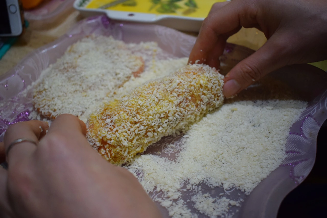 밀가루에 물을 개 얼른 덧입혀 빵가루도 한 겹 더했다.