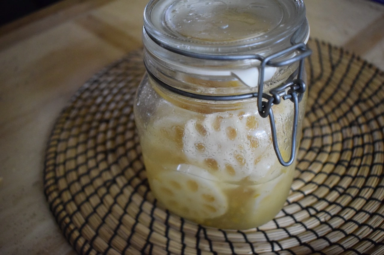 유자청과 식초로 담가 연근의 하얀 속살을 그대로 남겨뒀다.