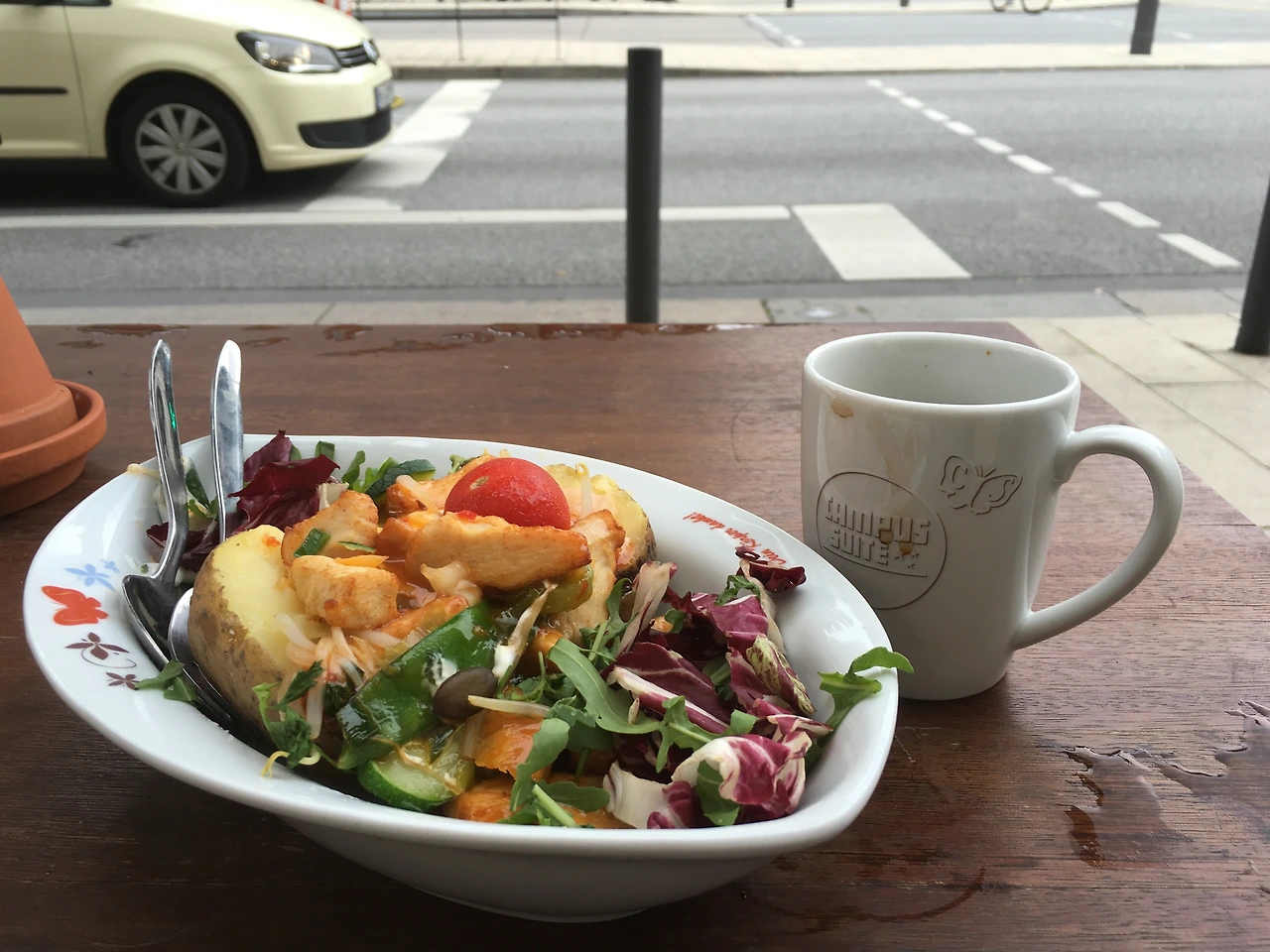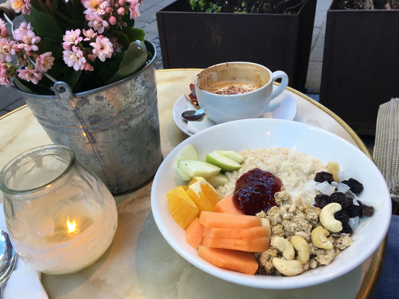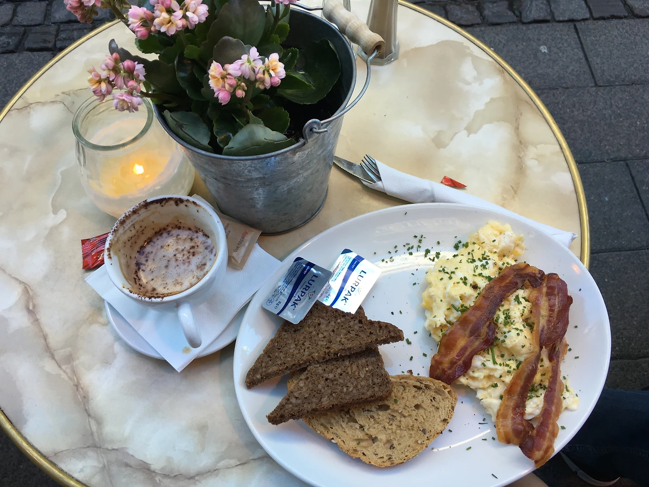 시내로 가는 길목에 있던 야외 테이블에서 즐겼던 아침이라 오고 가는 사람들 구경하기 좋았던 아침.
