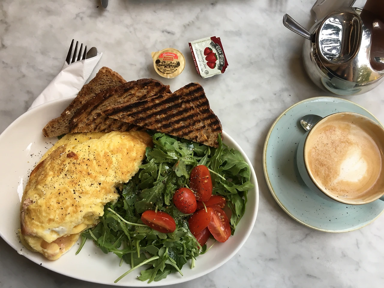연어살을 듬뿍 넣은 커다란 오믈렛에 토스트, 샐러드 한 바가지.
