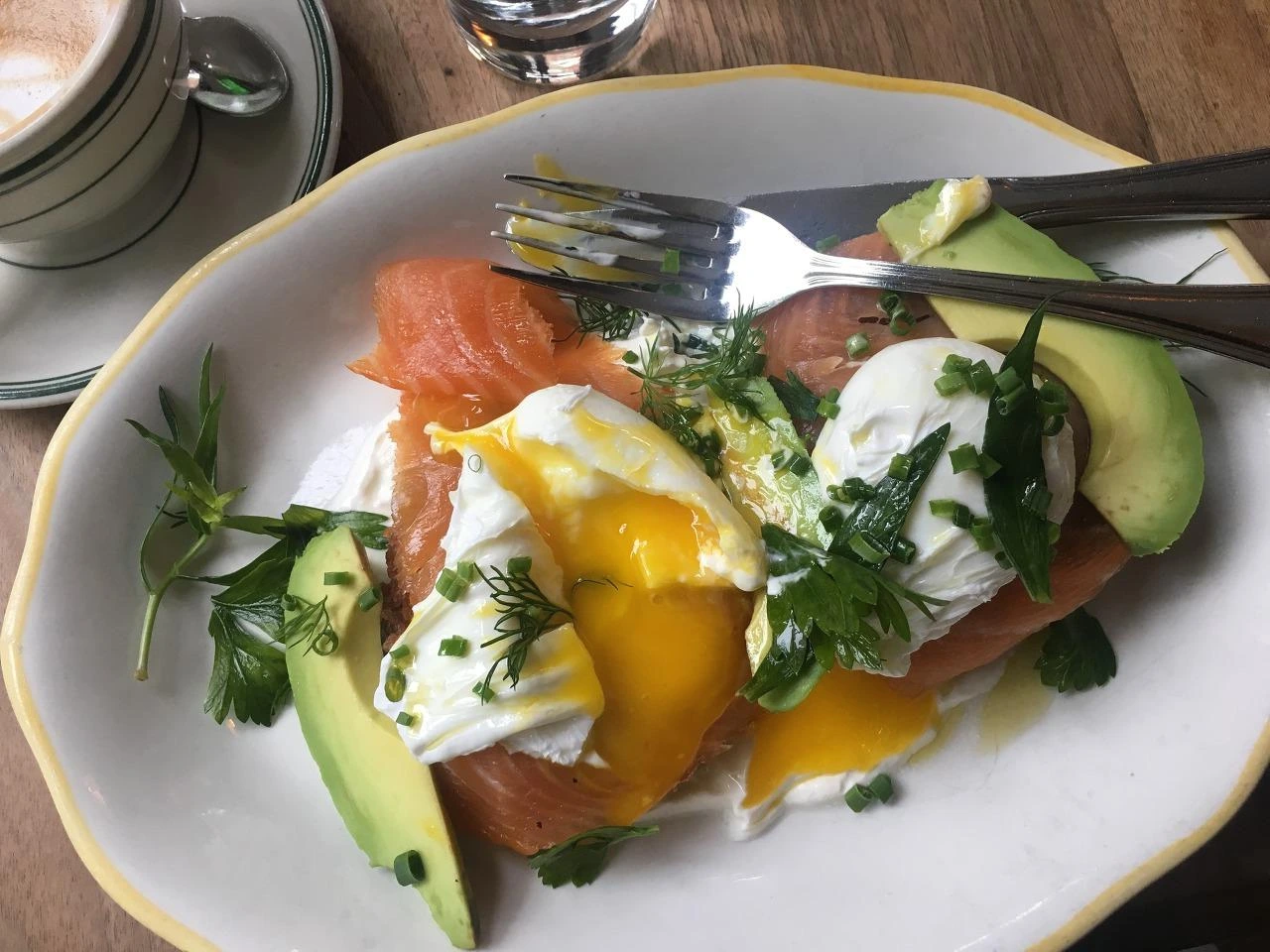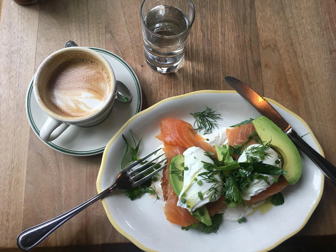 안 뵈지만 연어 아래는 라크스 Latkes, 제대로 튀겨낸 도톰한 감자전 비슷한 게 깔려있고 사워크림과 완벽한 수란까지 한 입 한 입 아껴먹었다.