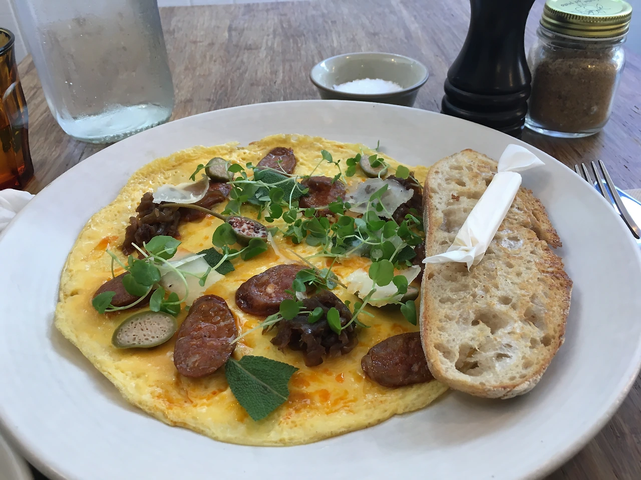 사탕처럼 포장한 버터와 함께 고소한 사워도우가 함께 나왔다. 오픈 샌드위치에 이어 오픈 오믈렛이라는 게 독특했다.