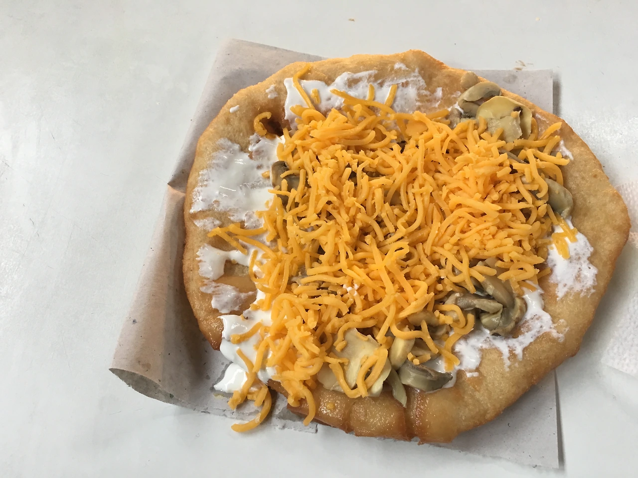 얼굴보다 커다랗고 두툼한 반죽을 통으로 튀겨내 위에 사워크림과 체다치즈, 양송이버섯 올린