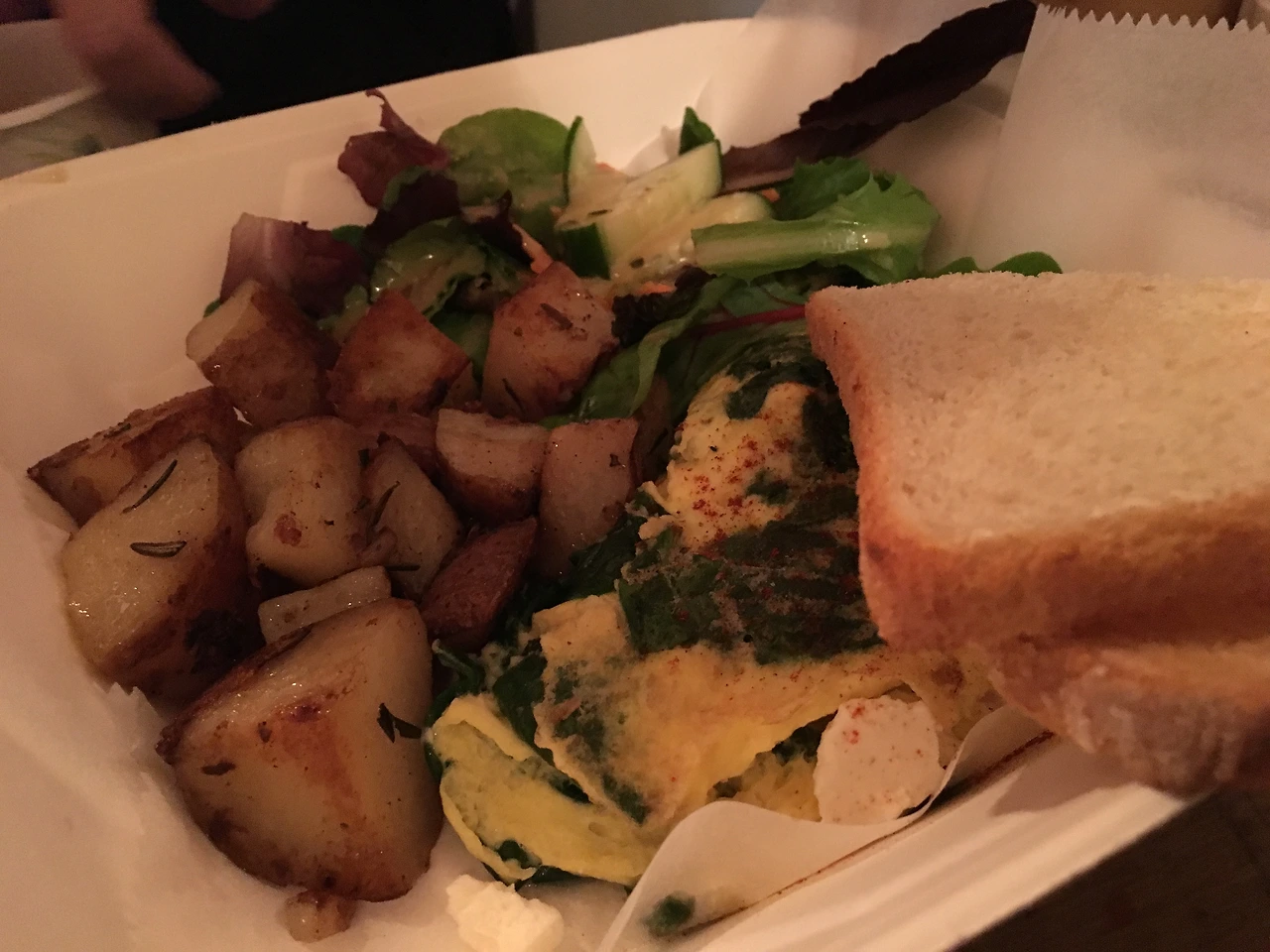 페타 치즈를 넣은 오믈렛에 로즈마리와 구운 감자.
