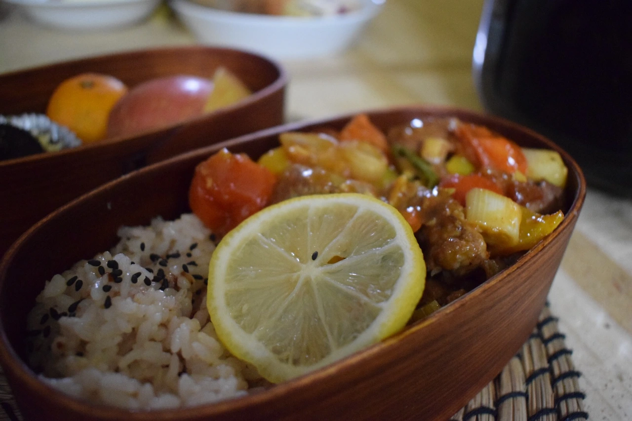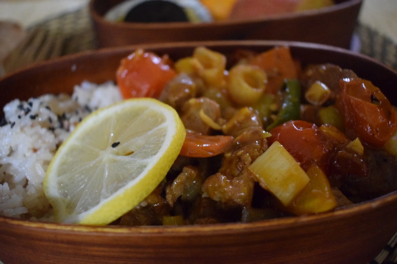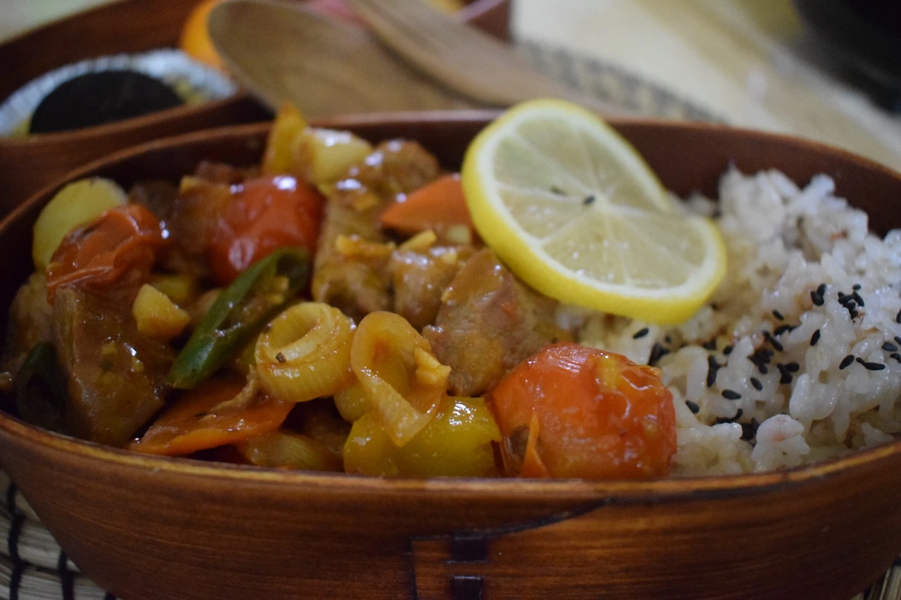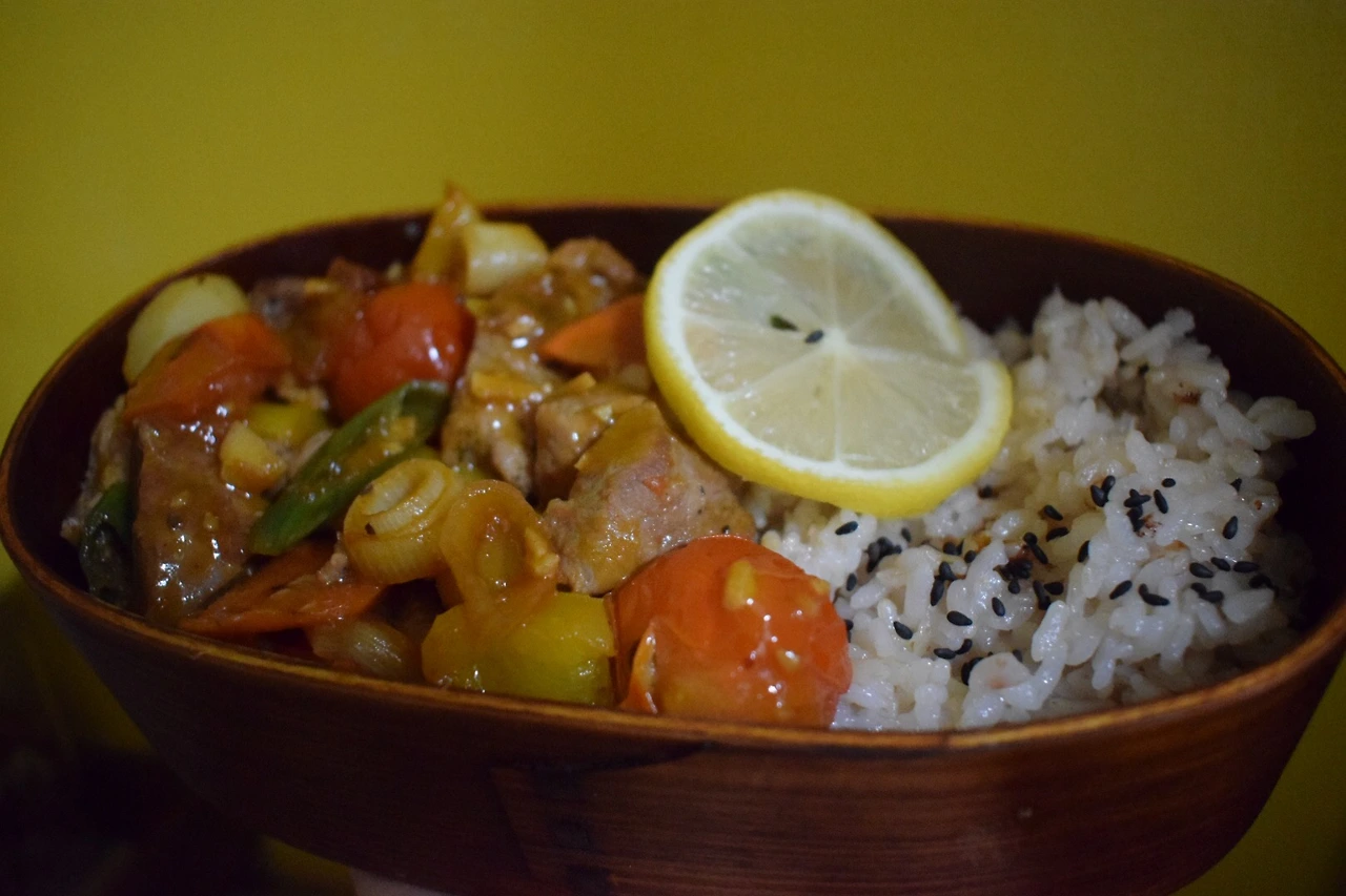 찰수수밥에 챱 스테이크, 레몬 한 조각, 검은깨.