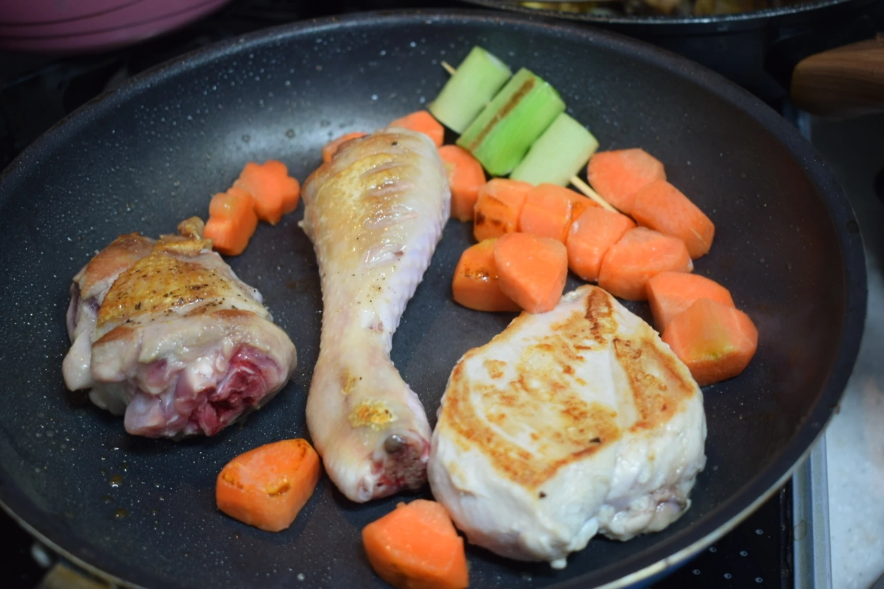 커다란 닭다리를 중심으로 해서 뭉근하게 끓인 소스를 채소와 얹을 생각이다.