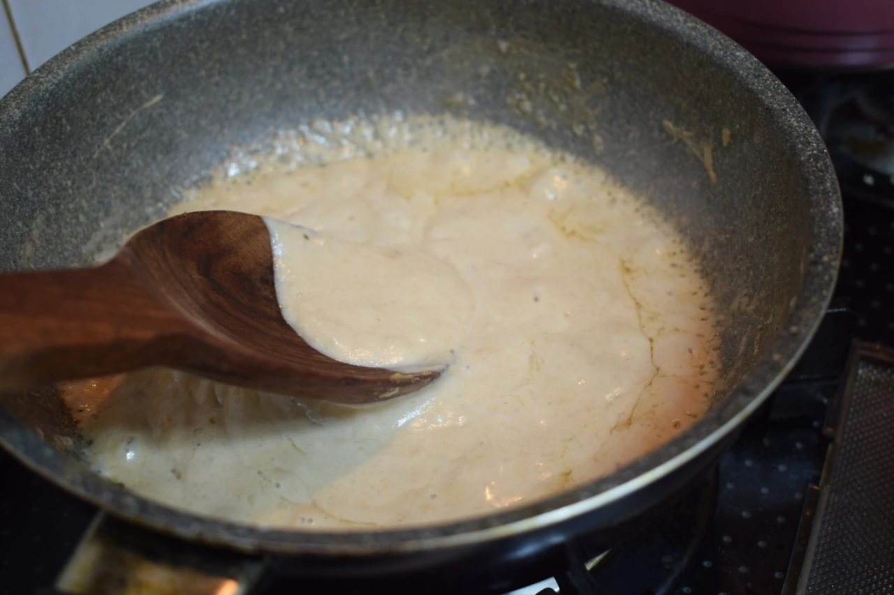 소스는 아침에 다시 끓이기만 할 요량으로 버터에 밀가루로 루를 만들고 육수, 생크림을 나누어 부어 걸쭉하게 만들어두기.