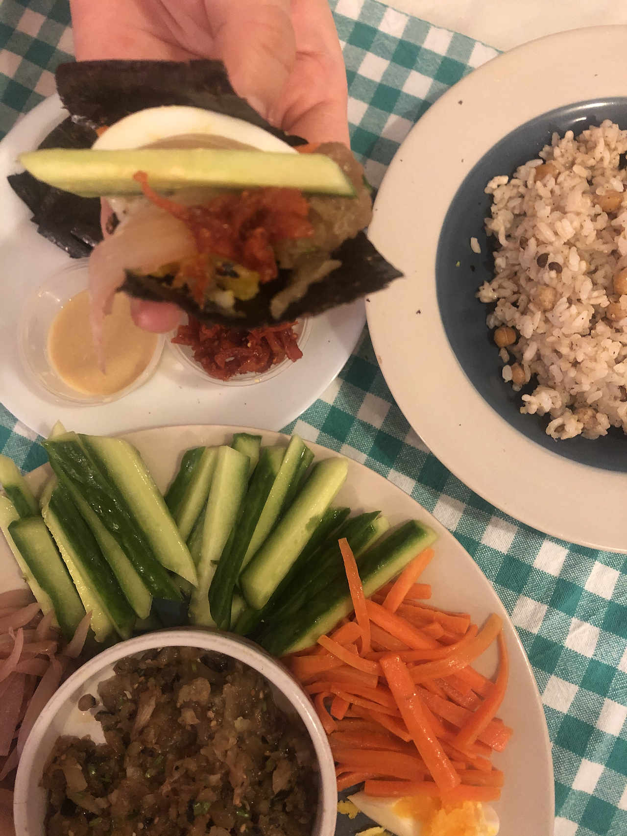 약간의 특별한 상차림이라는 것도 티 내려고 다양한 색감을 표시하고자 셀프 김밥으로 재료를 다 까발린다.