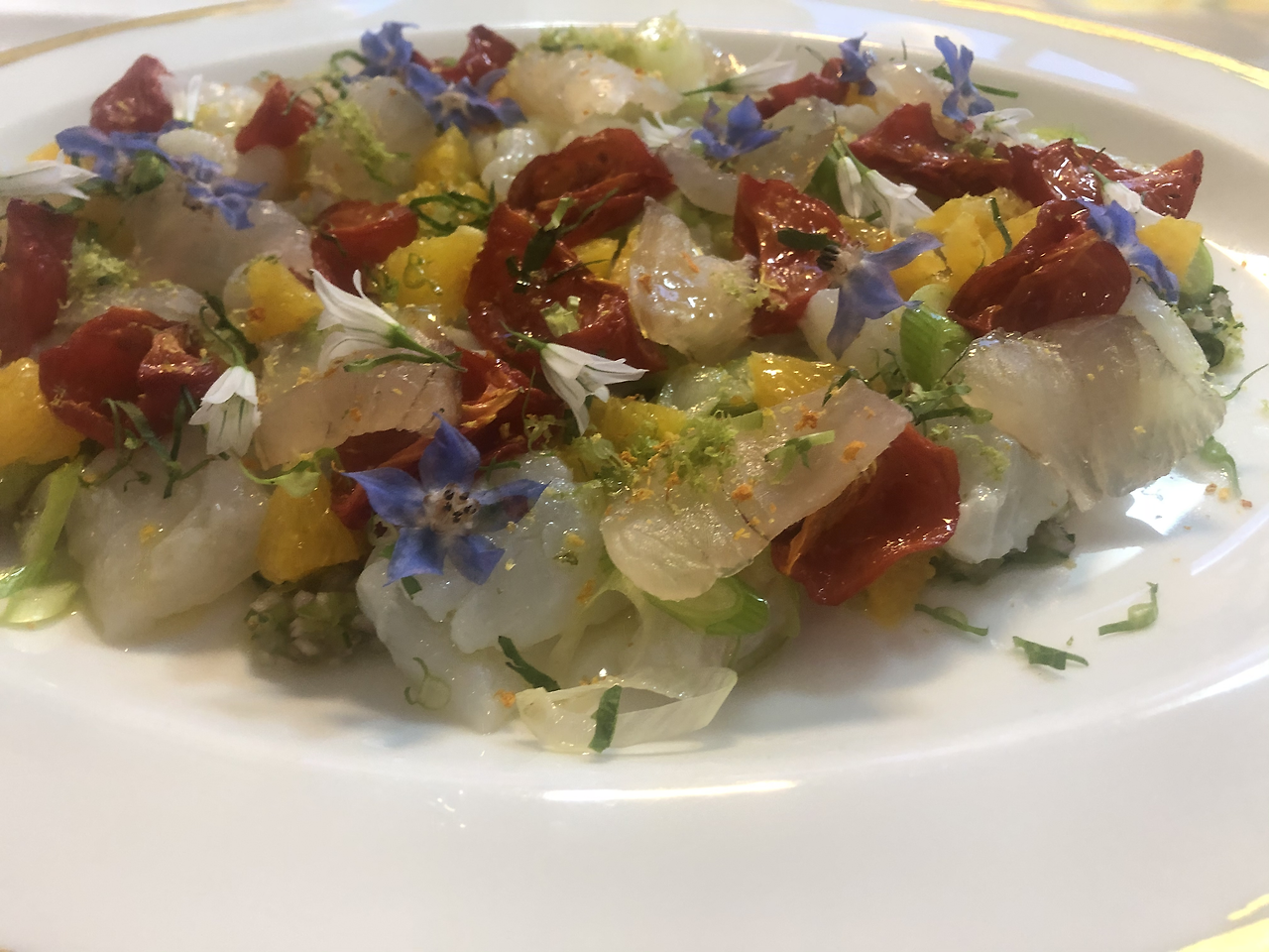 어찌어찌 마조렘을 다 썰고 난 나는 엑스트라 버진 올리브유에 라임, 오렌지즙과 함께 소금을 넣어 광어를 15분간 향긋한 목욕을 시켜준다.