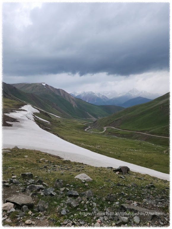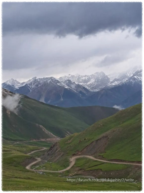구불구불 촘촘히 놓인 S 코스의 산길을 오르다 보니 잔설이 흩어져 있는 높이까지 왔다. 높은 산에 오르자, 고산 증세가 심해졌다. 움직일 때마다 어질어질해서 멀미가 났다. 이럴 땐 빨리 걷거나 뛰면 안 된다. 이 여름에 눈앞에 나타난 설산은 놓칠 수 없는 풍경이다. 슬로비디오를 찍듯 천천히 한 걸음씩 옮기며 가슴까지 눈 덮인 텐산의 모습을 사진으로 담았다. 육체적인 고통은 인생 통틀어 얻기 힘든 장면을 선물받았다.