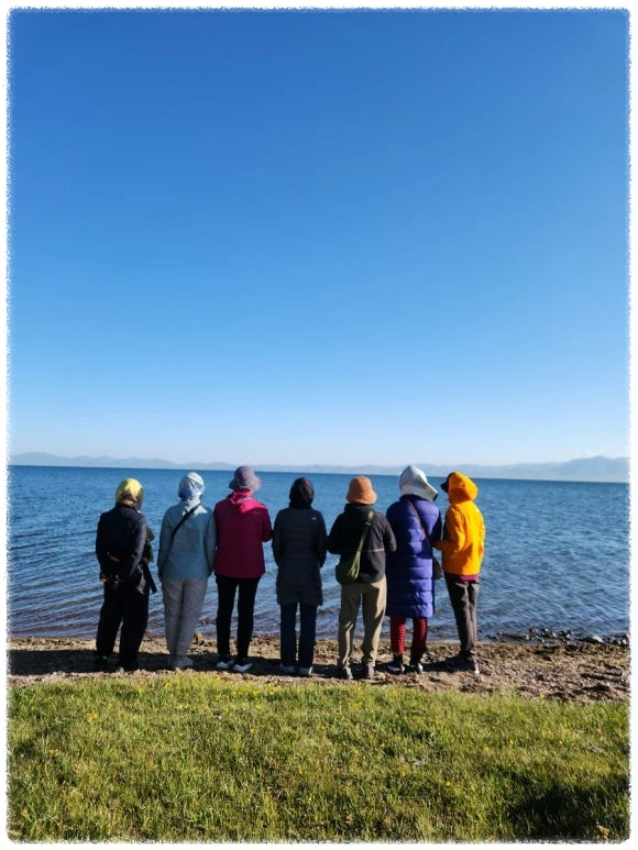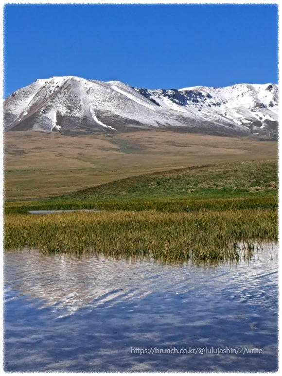 새날이 밝았고 우린 어제 늦게 도착해서 못 본 송쿨호수로 향했다. 바로 코앞이라 걸어서 5분이면 도착이다. 어젯밤 같은 고산 증세는 덜 했다. 꽃 계절을 벗어난 시기라 꽃도 잡초도 없는 허허벌판을 지나니 드넓은 호수가 보인다. 끝이 안 보이는 광활한 호수는 수평선을 만들어 바다인 척하고 있었다. 감탄하는 일행들의 메아리가 잔잔한 물결 위에 넘실거린다.