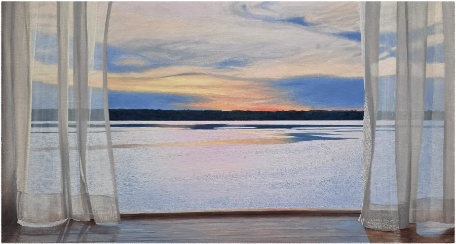 얇은 레이스 커튼은 세상 안과 밖의 경계에서 마음을 반쯤만 열고 여느 때처럼 지는 해와 바다의 실랑이를 지켜보고 있습니다. 바다와 하늘을 품은 큰 액자 같은 창은 나직이 혼잣말로, 떼쓰고 있는 해를 달래줍니다. '더 놀고 싶겠지만 푹 자고 내일 또 놀자. 나도 이제 쉬고 싶어.'