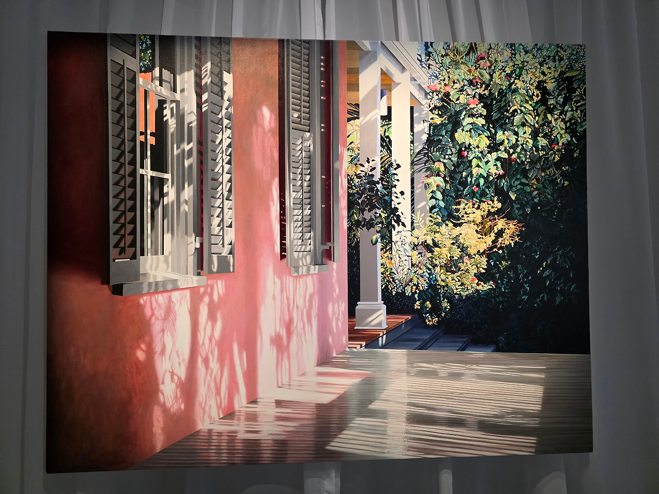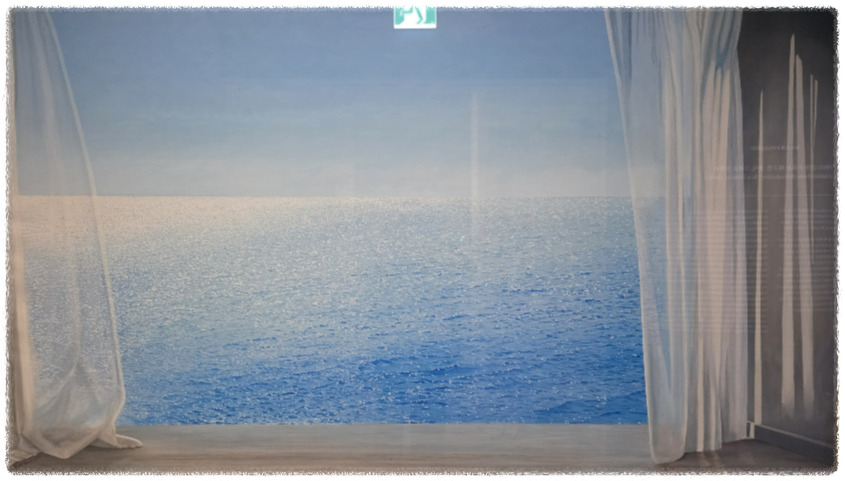 공간은 바뀌었지만 햇빛과 바람은 늘 함께 하였고 실외와 실내의 경계에는 만져보고 싶을 정도로 사실적인 커튼이 있었습니다. 전시 마지막에 그녀의 인터뷰가 나오는 동영상을 반복해서 보았습니다. 세 명의 아이를 키우며 미뤄 두었던 그림을 뒤늦게 다시 하면서 그녀는 늘 한결같았습니다. 그녀는 그림을 통해 현대인의 삶 속에서 '잠시 멈춤, 그리고 영원함'을 사색하도록 해 주었습니다. 내면의 평화와 공간의 감성을 전달하는 것에도 집중하였습니다.