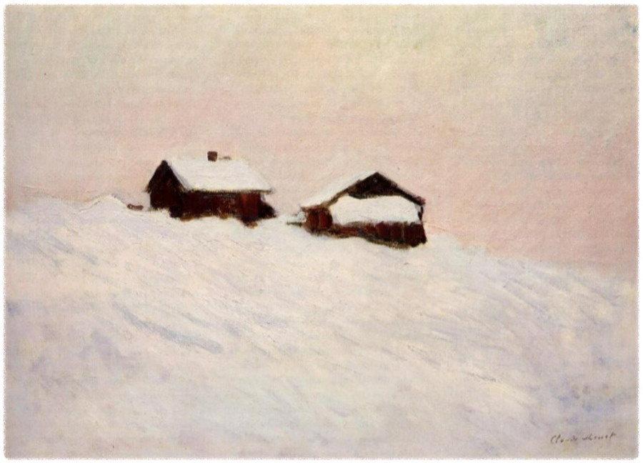 모네는 <수련> 시리즈뿐만 아니라 겨울의 정취와 빛이 내는 색채를 생생하게 재현한 <눈> 연작도 그렸다. 그의 눈 온 풍경에는 흰색만 있는 것이 아니었다. 눈이 주변에 반사되고 투과되어 변화된 미묘한 느낌도 그의 방식으로 겨울 풍경을 잘 살려냈다. 인상주의 화가로서 빛의 효과를 극대화하여 추운 겨울이지만 우아하고 평화로운 분위기를 만들어 주었다.