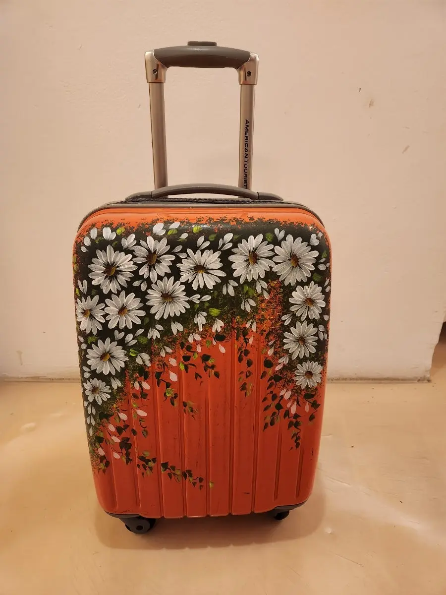 꽃피는 5월이면 갤러리 야외 정원에서 전시회를 했다. 정원에 핀 철쭉과 작약에 뽐내듯 그동안 배운 꽃들이 일상의 물건 속에서 피어나 웅성거리며 함박웃음을 짓는다. 식탁, 테이블보, 장화, 여행 가방, 항아리에 모두 들꽃 천지다. 낡아진 캐리어에 데이지 꽃을 피우니 세상에 하나밖에 없는 캐리어가 되었다.