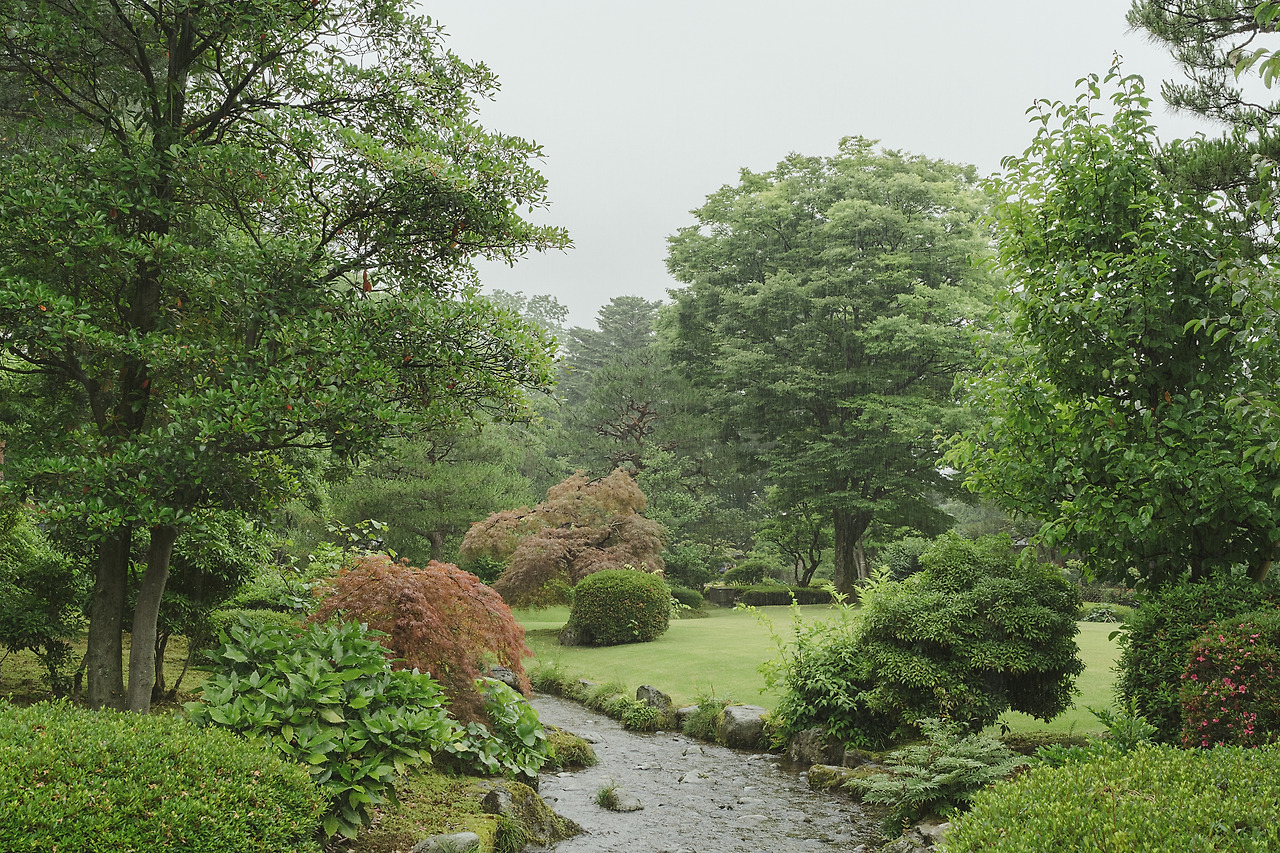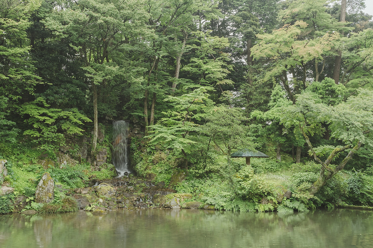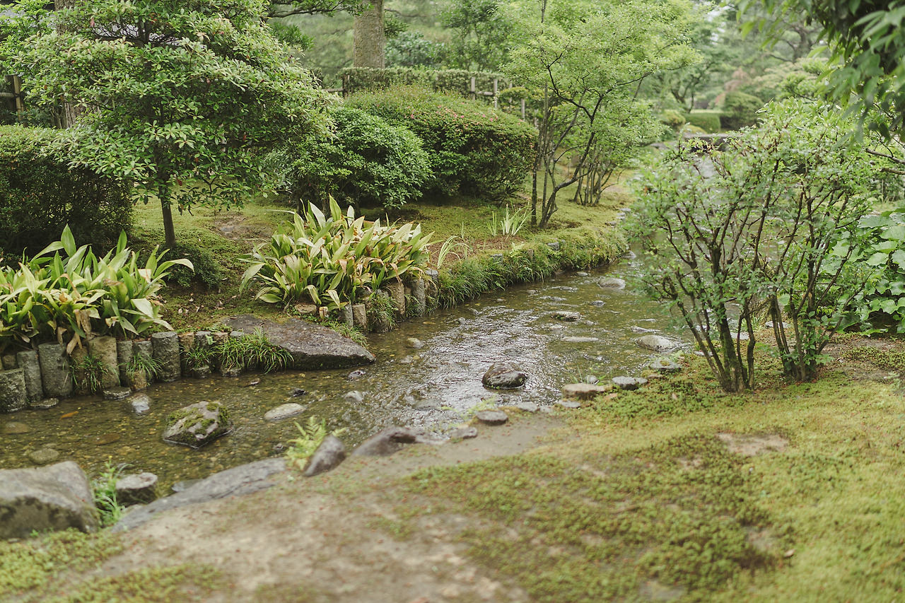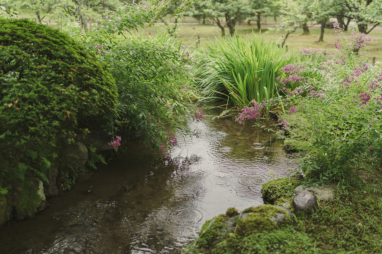 겐로쿠엔은 입구가 여러 군데 있는 것 같았다. 나는 가나자와 시청과 가까운 쪽 입구에서부터 출발했다. 버스를 타고 가면서부터 내리던 빗줄기는 점차 굵어졌고, 평소 같았으면 잔잔히 흘렀을 것 같은 시냇물도 제법 빠르게 흘렀다.