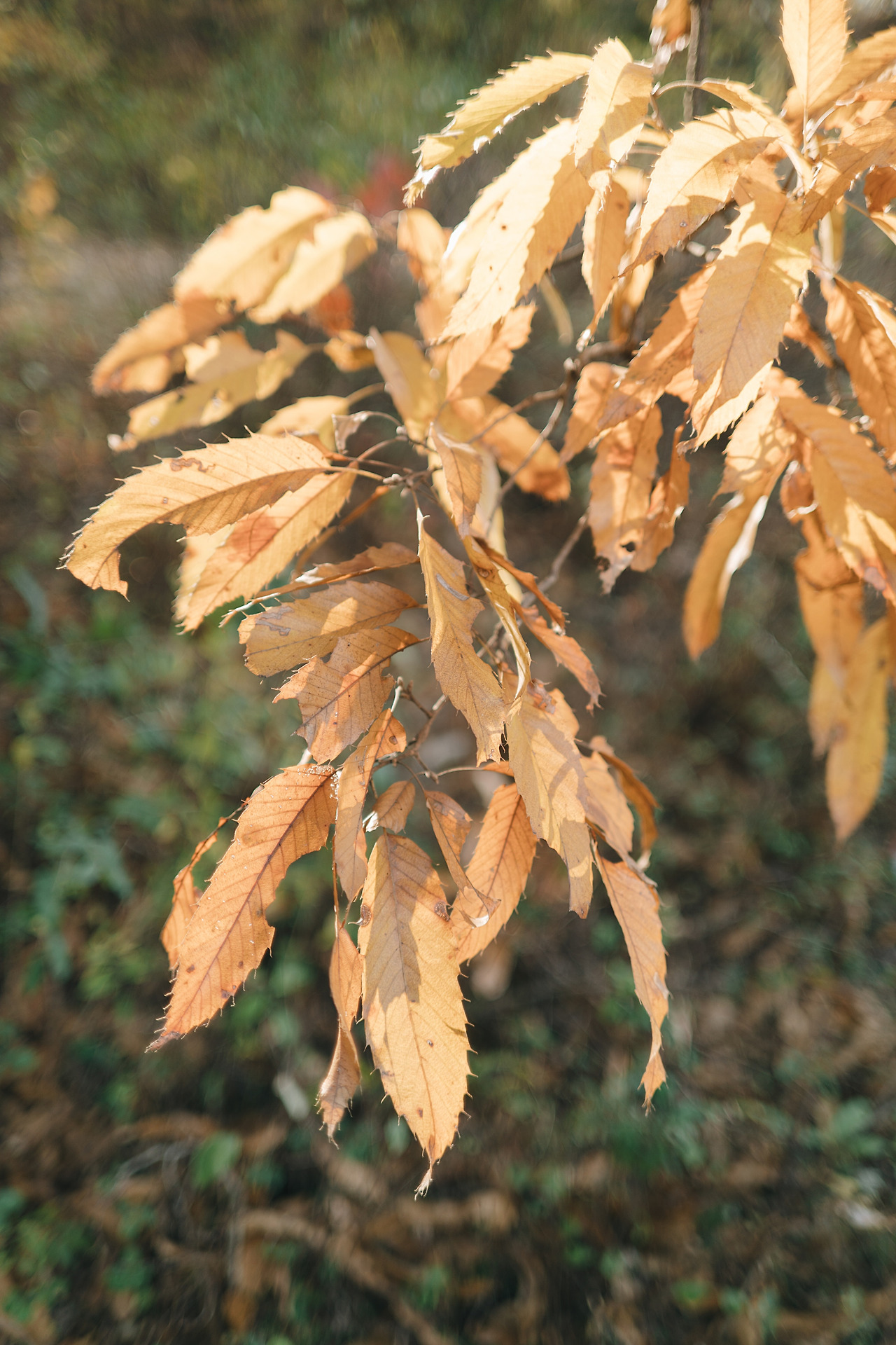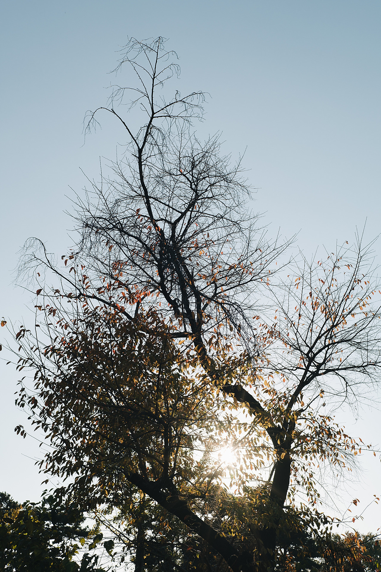바닥에 떨어진 잎과 똑같이 말랐음에도 나무에 붙어있는 잎들이 보인다. 이런 잎들은 한겨울에도 바람 방향에 따라 휘어진 채로 매달려있을 것이다.