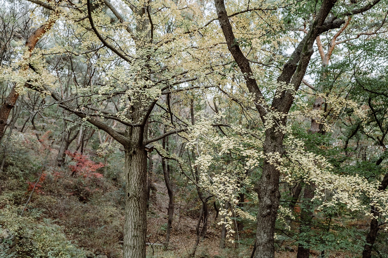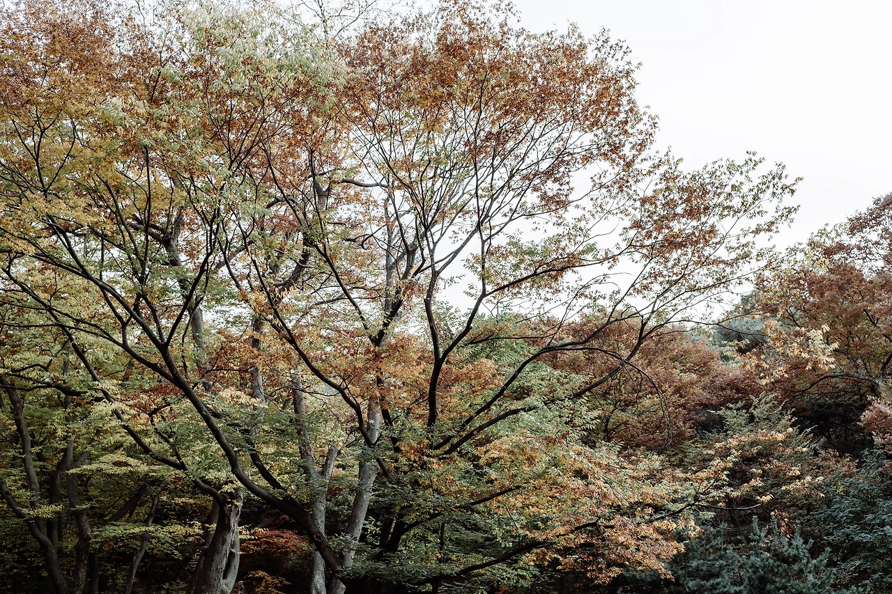 가을이라고 모든 나무가 다 노랗고 빨갛진 않다. 시차를 두고 알록달록하게 변하는데, 마치 온 세상이 빨갛고 노란 풍경을 기대하고 왔다면 실망할 수도 있다. 하지만 나는 이런 초록색과 단풍이 섞인 풍경을 더 좋아한다.