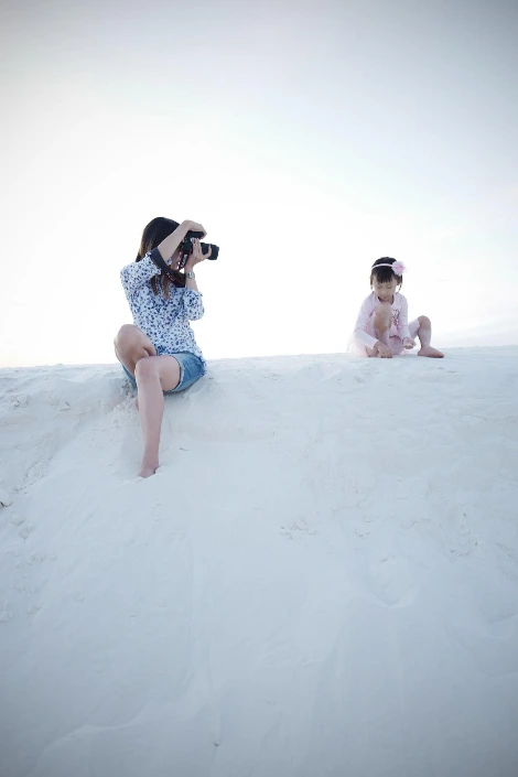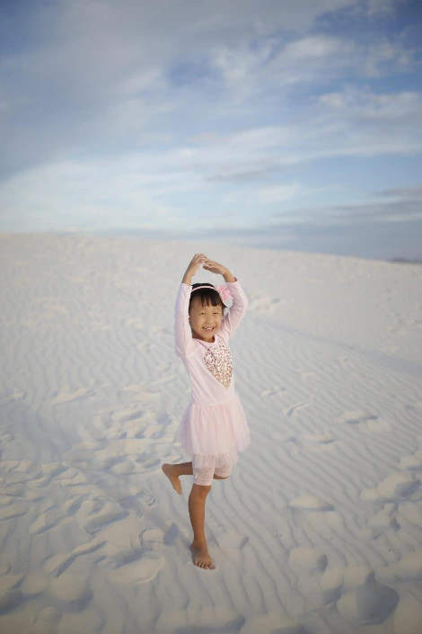 마침 해가 살짝 기울어 기온도 적당해졌다. 여름의 끝 같은 서늘한 바람이 불어온다. 언덕 위로 올라오니 눈앞에 펼쳐진 광활한 사막이 아름답게 빛난다. 아이는 이미 내 손을 뿌리친 지 오래다. 하얀 눈밭 같은 모래 위를 뛰어다니며 발자국을 새기고 있다. 오늘을 위해 지호는 모처럼 예쁜 원피스를 챙겨 입었다. 하늘을 향해 동그랗게 팔을 모았다. 빙그르르 돌다가 다리를 뒤로 뻗으며 각양각색의 포즈를 취하기 시작했다.