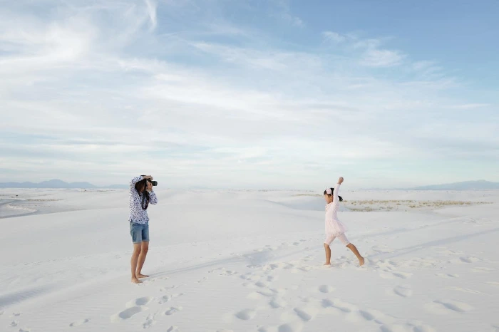 아이는 이내 모래 바닥에 누워서 팔다리를 대자로 뻗어 날갯짓을 했다. 누구보다 자유로운 몸짓으로 화이트샌즈를 품에 안았다. 아이를 따라서 모래 위에 누워봤다. 새로운 앵글이 나타났다. 누워서 본 화이트샌즈에는 하늘과 모래의 경계가 없다. 잠시 누워서 또 다른 세상을 바라봤다. 밤이 되면 저 하늘에 고운 모래처럼 무수히 많은 별이 쏟아지겠지.