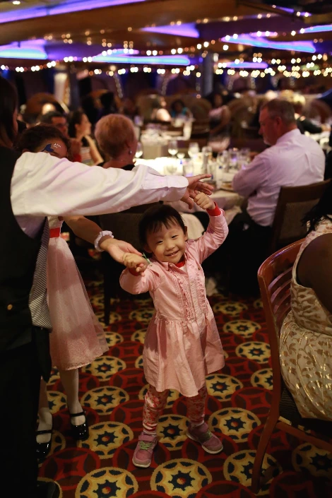 그날 크루즈에서는 정장을 입고 오라는 드레스코드를 안내했다. 준비해온 원피스를 드디어 꺼내 입고 레스토랑에 입장했다. 드레스와 턱시도 차림의 사람들이 하나둘 자리를 채웠다. 멀쩡하게 차려입고 메뉴판 윗줄부터 맨 아랫줄까지 마음대로 메뉴를 주문하며 갑자기 행복지수가 상승했다. 그때 레스토랑에 흘러나오던 음악의 볼륨이 커졌다. 사람들이 일제히 무릎을 감싸던 냅킨을 펼쳐 흔들기 시작했다. 우리는 영문을 모르고 두리번거렸다. 알고 보니 크루즈의 일정 중 가장 특별한 밤이 시작됨을 알리는 신호였다.