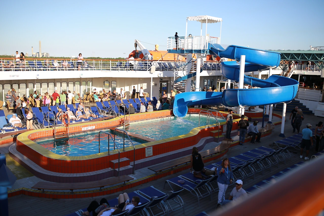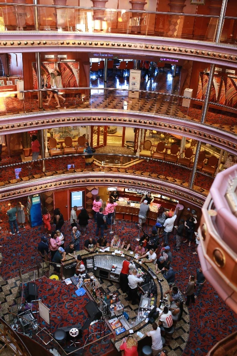 짐을 풀고 본격적으로 크루즈 시설을 돌아봤다. 커다란 빌딩을 통째로 배 위에 얹은 모습이다. 엘리베이터가 다니는 중앙 통로에는 호텔처럼 화려한 샹들리에가 걸려있다. 그 통로를 중심으로 카지노와 공연장 등을 오갈 수 있다. 가장 위층 옥상에는 야외 수영장이 있다. 벌써 선베드를 한 자리씩 차지하고 누워 선탠하는 사람들이 보인다.