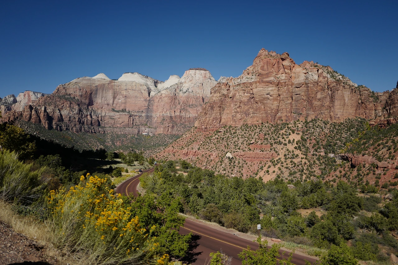 비행기를 타고 라스베이거스에 내려서 캠핑카를 찾았다. 마트에서 장을 가득 본 뒤, 여행의 출발점인 자이언 캐니언으로 향했다. 첫날은 자이언 캐니언 국립공원 바로 앞에 있는 캠핑장에서 묵기로 했다. 쨍한 햇볕에 저절로 눈이 감긴다. 반팔과 반바지를 입었지만 더위에 후끈후끈하다. 캠핑장 앞 다운타운에 들어왔다. 작은 시내가 사람들로 북적인다. 멀리서 깎아지른 듯한 캐니언의 사암 바위가 나타났다. 커다란 계곡을 끼고 있는 돌 산 같다. 이국적인 배경 속에 사람들이 오가는 모습을 바라보니, 마치 서부영화 속 세트장에 들어온 기분이다.