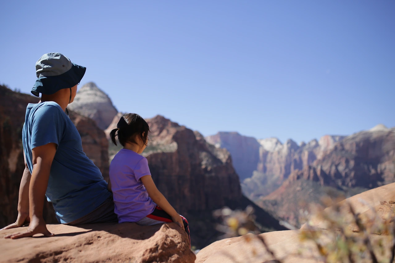 드디어 정상에 도착하자, 아이는 머리 꼭대기에 있는 햇살만큼 환하게 웃었다. 발아래 까마득한 협곡이 내려다 보인다. 이 광경을 보기 위해 한 시간 가량 땀을 흘리고 올라온 보람이 있다. 둥글둥글하고 평평한 바위에 앉아 화려한 자이언 캐니언의 경치를 만끽했다. 바위산을 배경으로 셔터를 눌렀다. 카메라 각도를 바꿀 때마다 계속해서 새로운 프레임이 만들어졌다.